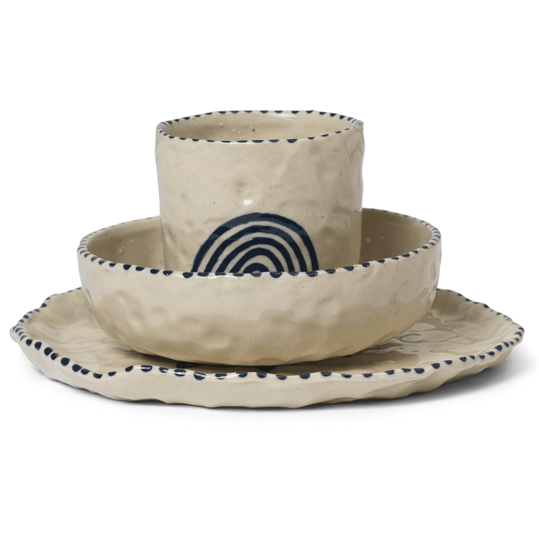 The Ferm Living Naive Ceramic Set features intuitive imprints made by our skilled artisans. Inspired by nature’s colors, each piece is adorned with hand-painted motifs. With the distinct marks of the makers’ hands, no two items are the same, reflecting a commitment to craftsmanship and individuality in every piece.
