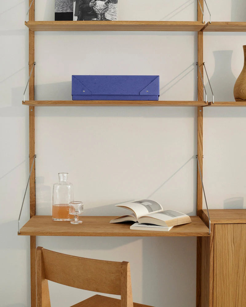Part of the modular Shelf Library system, the Desk Section offers a flexible storage solution crafted from enduring materials. Its adaptable design allows shelves and rails to be repositioned over time, making it ideal for any space. Both functional and elegant, it’s designed to grow with you.