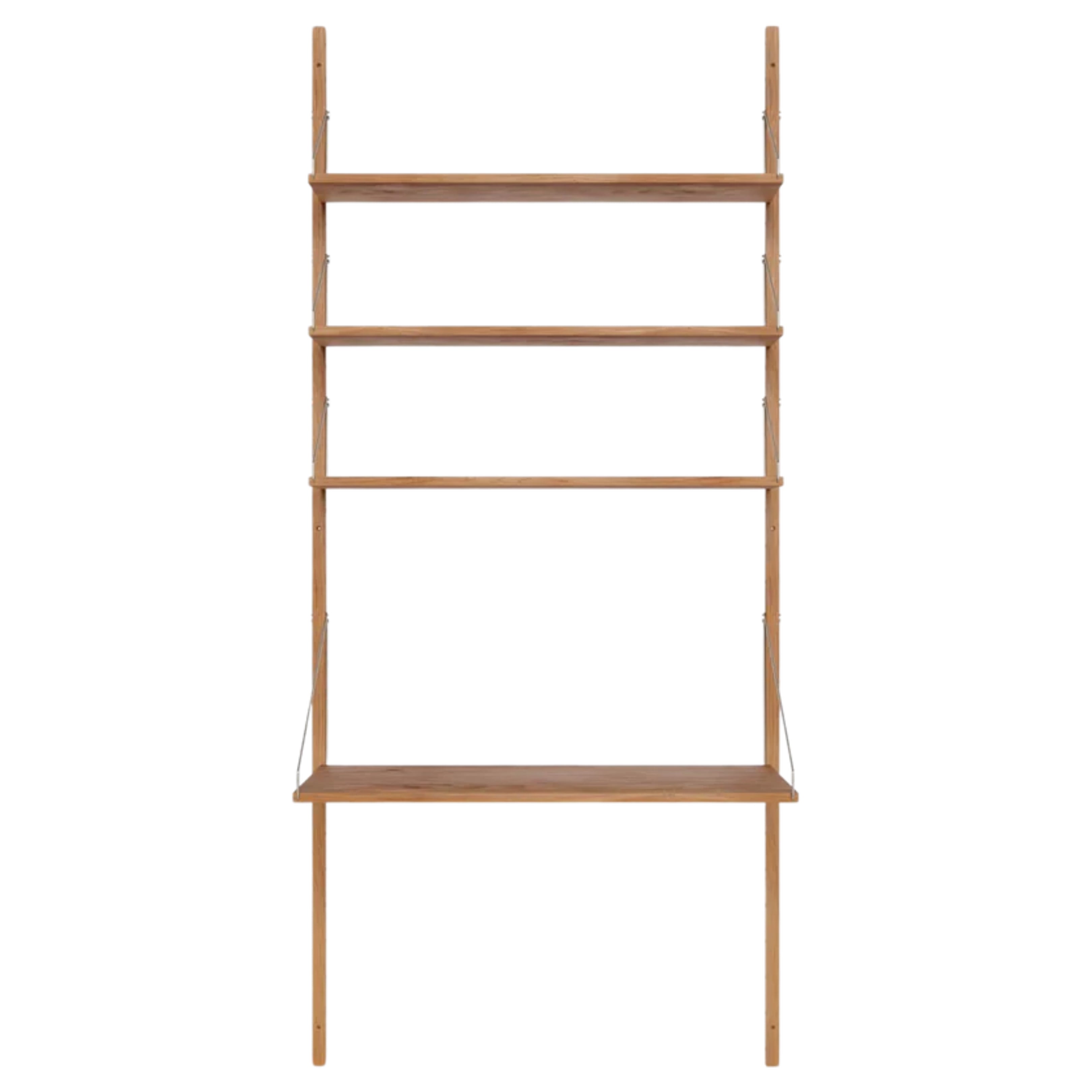 The FRAMA Shelf Library Desk Section H72 in Natural Oak is a contemporary take on the classic rail-mounted shelving systems first introduced by Scandinavian cabinetmakers in the 1930s—a design approach later embraced by mid-century architects and designers. Created by Kim Richardt for FRAMA in 2016, this system offers a refined evolution of that legacy, featuring its own distinct design language. With its modular nature and timeless materials, the Desk Section adapts effortlessly to a variety of spaces, offering both form and function in equal measure.