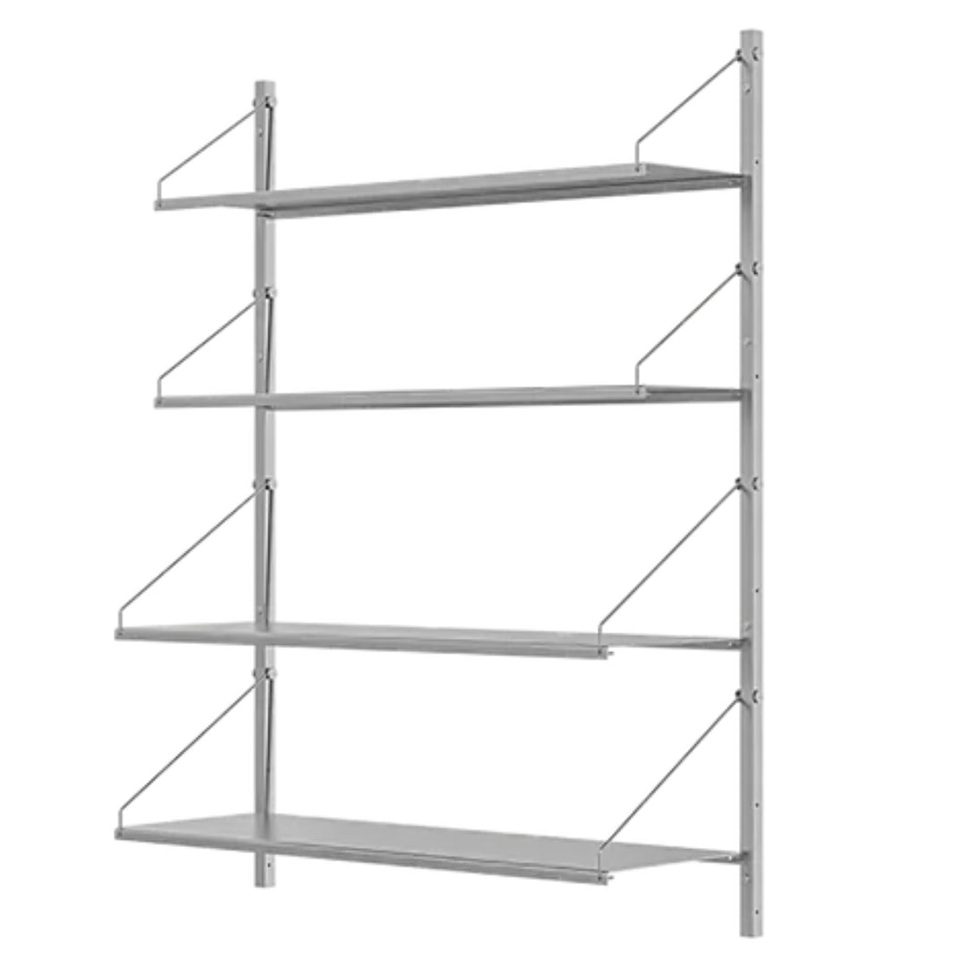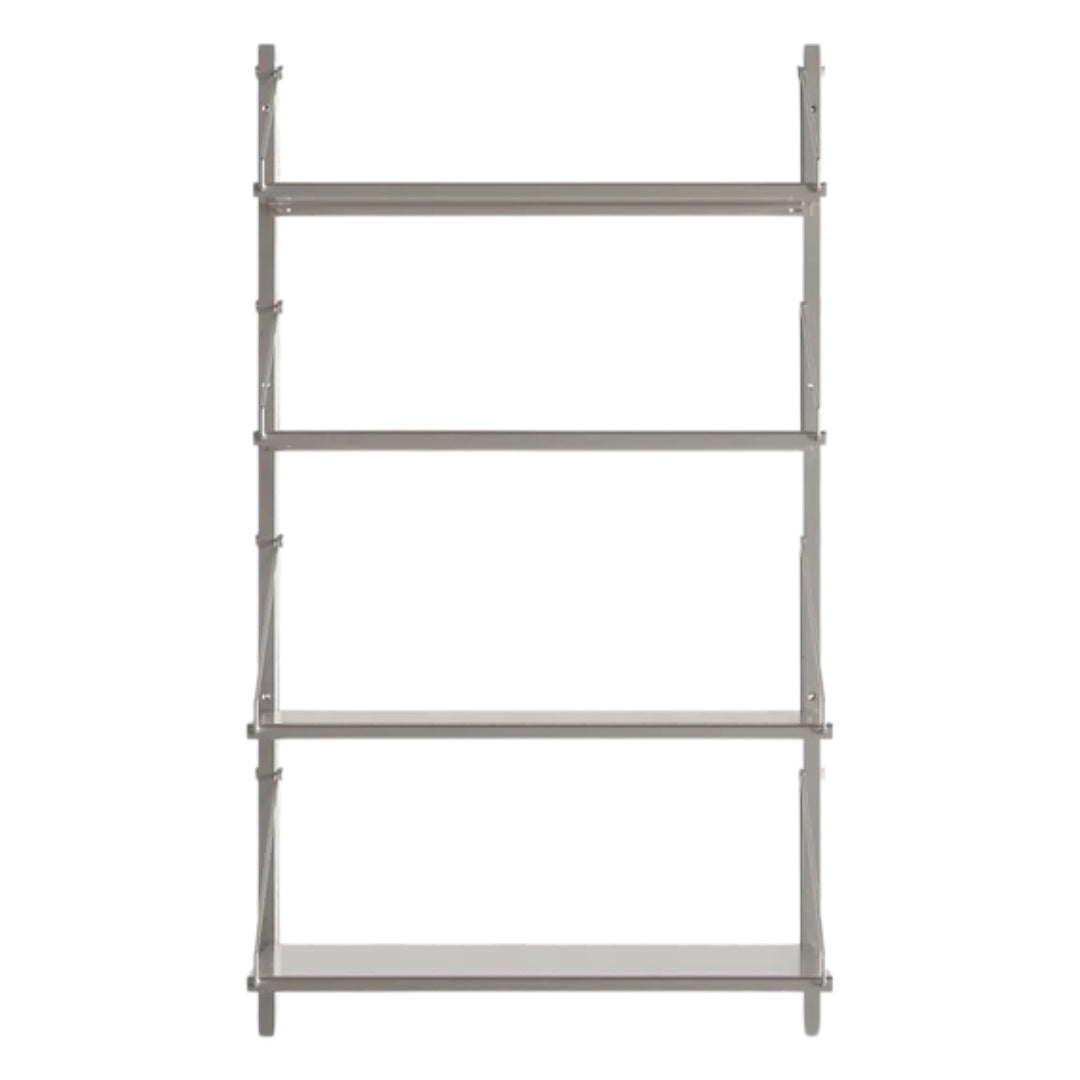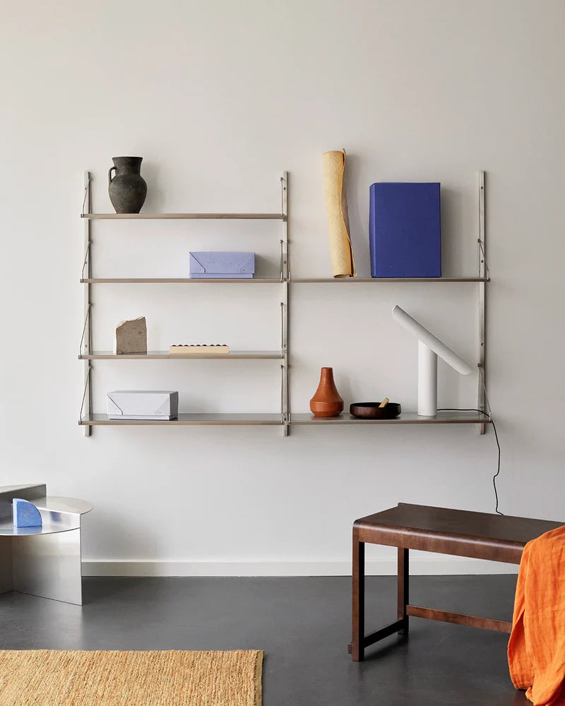 The FRAMA Shelf Library Single Section H42.7 in Stainless Steel is a modern interpretation of the classic rail-mounted shelving systems first introduced by Scandinavian cabinetmakers in the 1930s and later embraced by mid-century designers. Designed by Kim Richardt for FRAMA in 2016, this version brings a refined, contemporary perspective to a timeless concept.