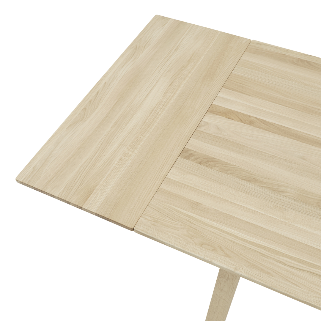 The MUUTO Earnest Extendable Table Extension Leaves for both the 205 x 100 and 260 x 100 sizes. offers a fresh take on the classic Scandinavian wooden table design. It features a manual extension system with apron pulls and a secure locking mechanism, all made from solid oak, effortlessly blending function with form.
