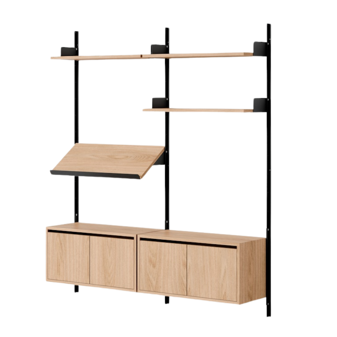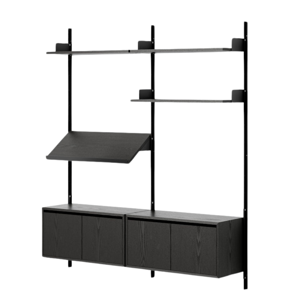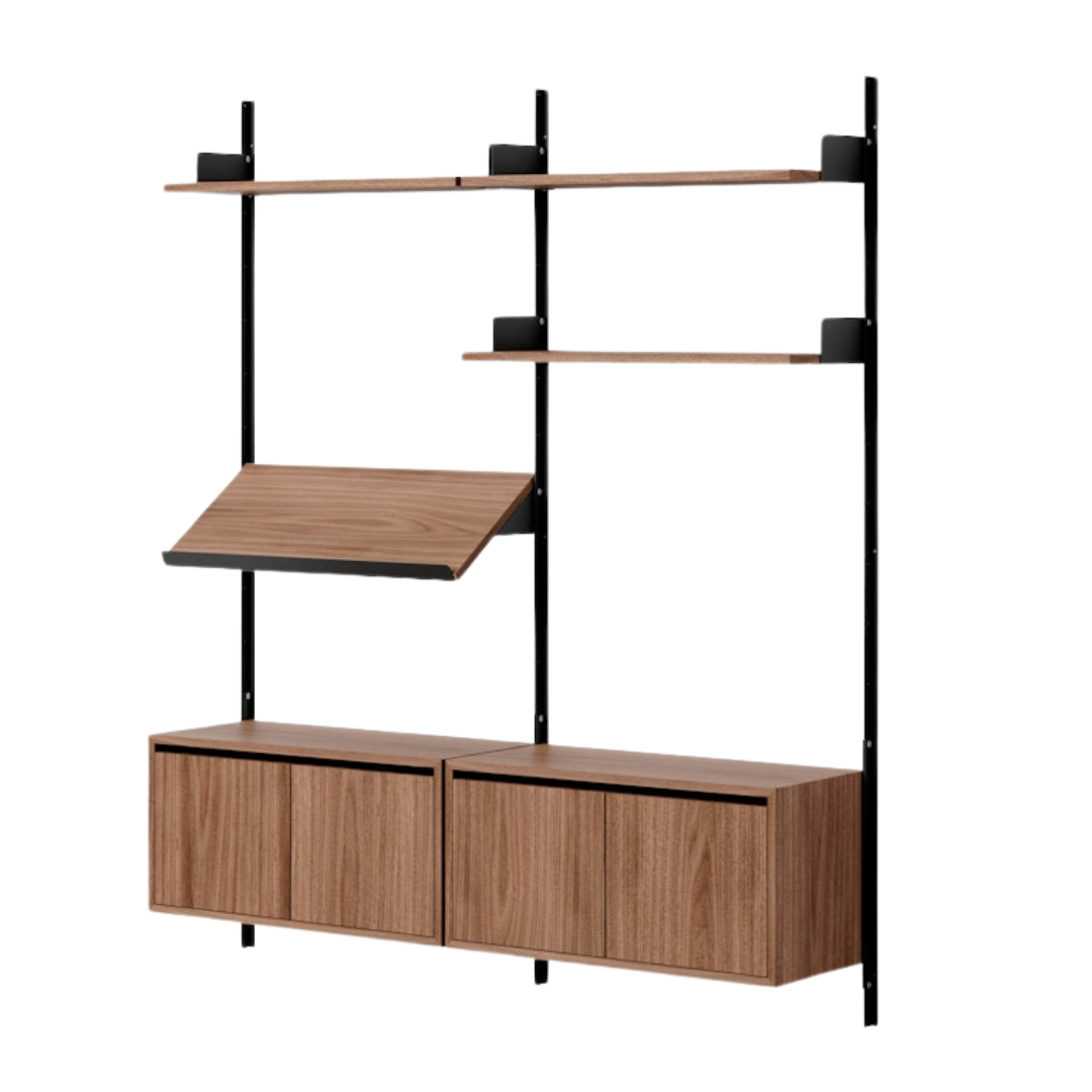 The New Works Living Shelf Cabinets Low with Doors is a wall shelf configuration from the New Works Shelving System. Packed with understated details yet also stripped down to the bare essentials, this flexible shelving system effortlessly blends into a variety of spaces. Notice the angular profiles of the wall bars and the integrated bookends that keep things in place. The shelves are attached with flat knurled stainless steel screws that give an honest yet refined look. The New Works Shelving System is meant to grow with you as your needs evolve.