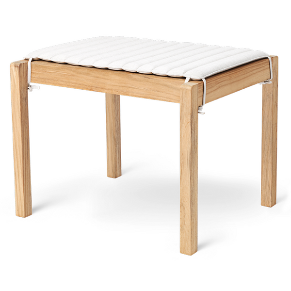 The BM5565 Outdoor Deck Chair with Footrest: also a part of Børge Mogensen's series reintroduced by Carl Hansen & Søn. He wanted to design pieces that could be folded flat and stored away or hung on the wall as a decorative element when not in use. The result is a series of outdoor furniture that is comfortable, functional, space-saving, and made with quality untreated Teak wood. The chair's slats are intentionally shaped to support the body.
