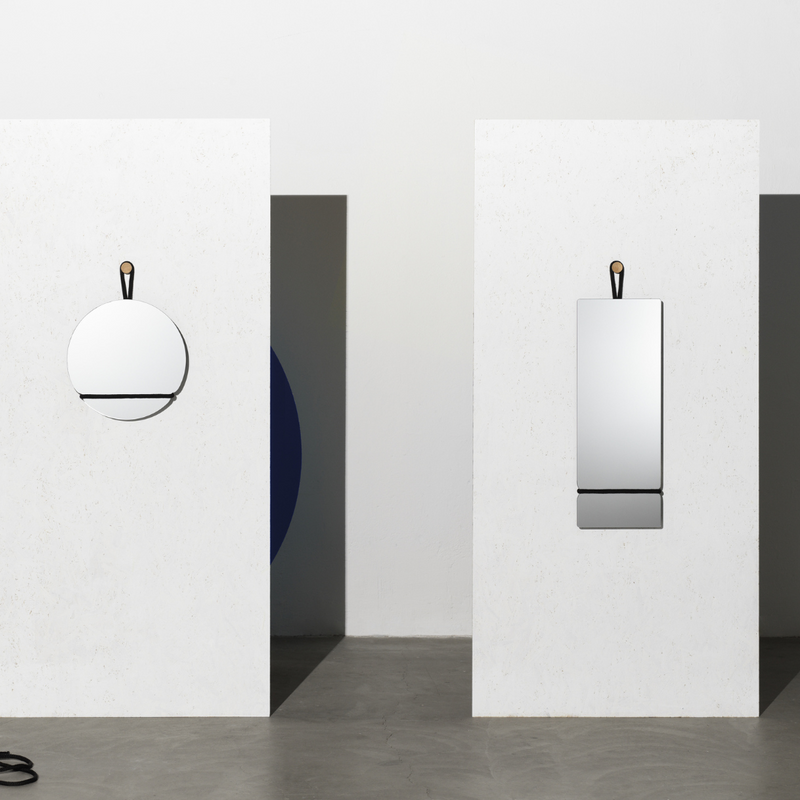 “What more do you need than a rope, a knob, and a reflective surface to put a mirror on the wall?” asks Bjurström. “Just tighten the lasso somewhat around the middle of the glass, thread it through the inserts on the back and secure it to the wall with the knob, and you have a tactile contrast between textile softness and perfect metallic shiny glass.”