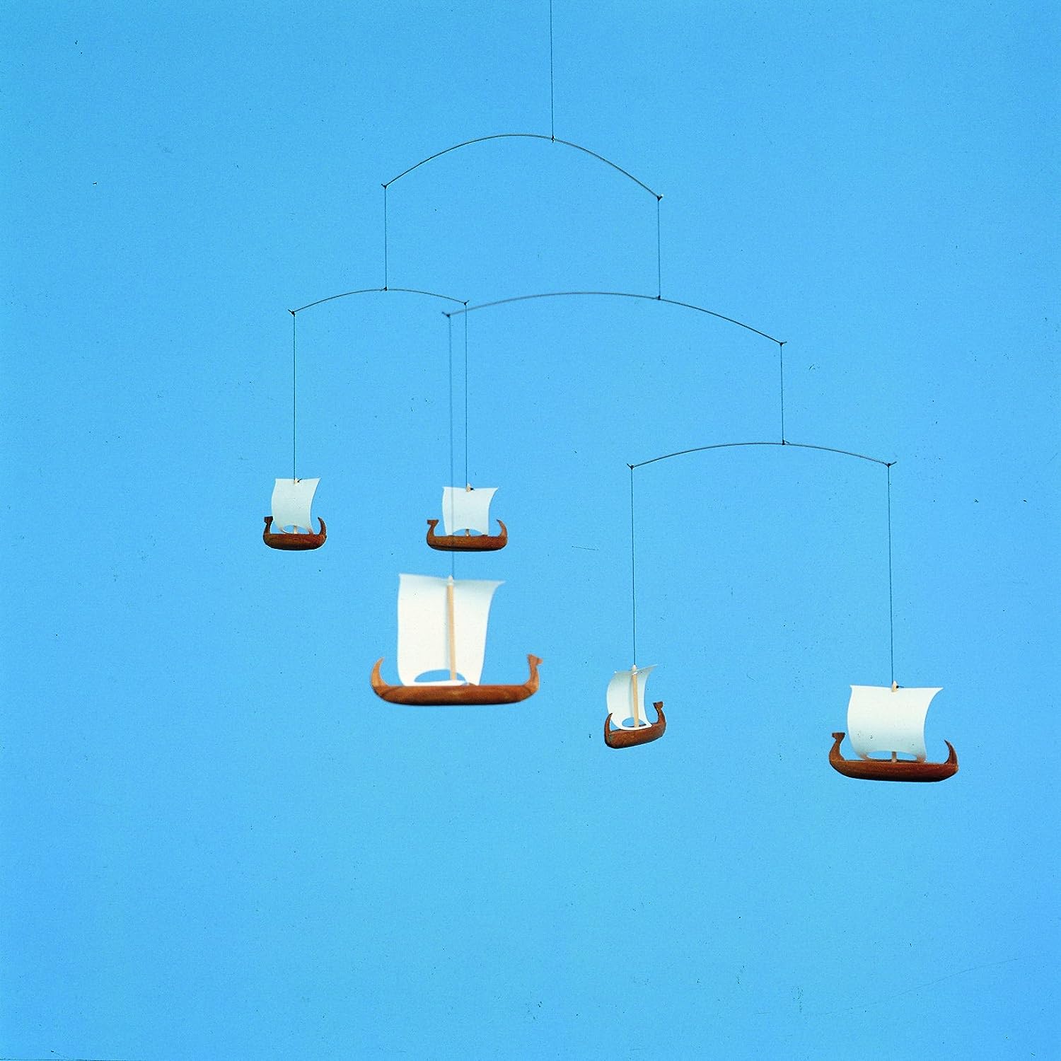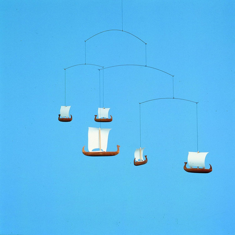 The Flensted 5 Viking Ships Mobile honors the graceful movement of traditional Viking ships, which once sailed far and wide all around the world. Made by hand in Denmark with light, high-quality teak wood.