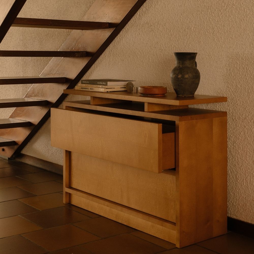 Explore freestanding storage with a gently surprising presence that combines geometric rhythm with lightness.