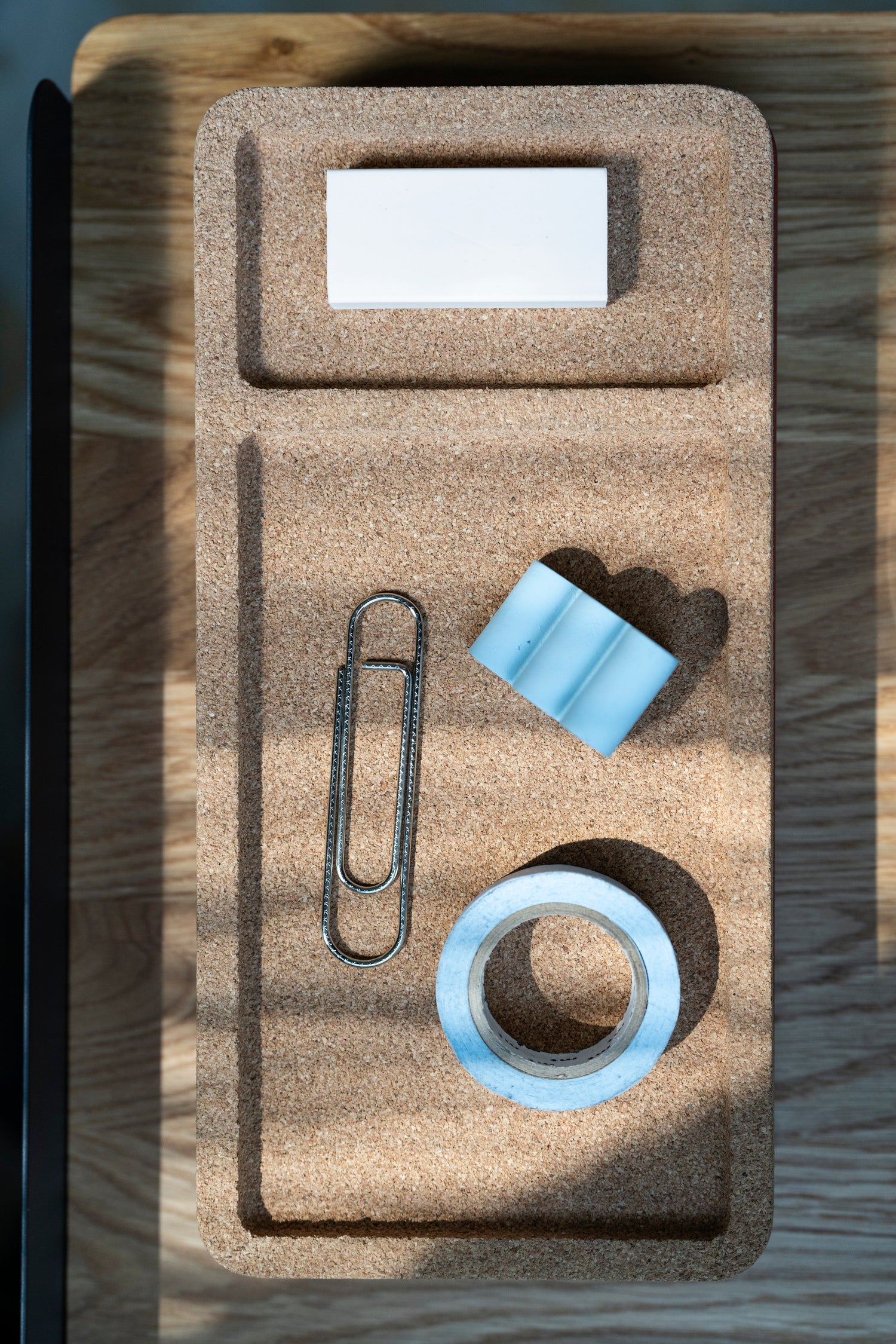 The Arrange Desktop Series is fun table top organizer that makes any workplace a little more fun. The trays are made from 100% recycled plastic and paired with lids of anodized aluminum for the Multi color configuration or cork when ordered in Grey.