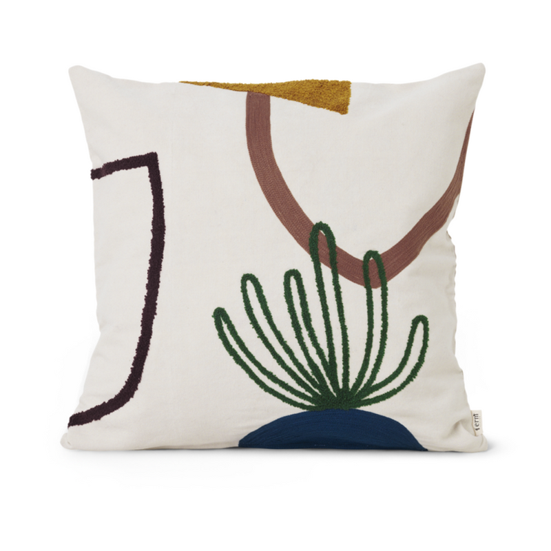 Ferm Living Mirage Cushion Island features imagery found in the mystic atmosphere of oasis and desert paradises. The Mirage series turns objects into abstract shapes and beautiful forms. The large cushions are made of cotton in one piece so that the pattern continues on both sides. The pillows come in four versions of nature-inspired artwork, held in deep and contemporary colors.