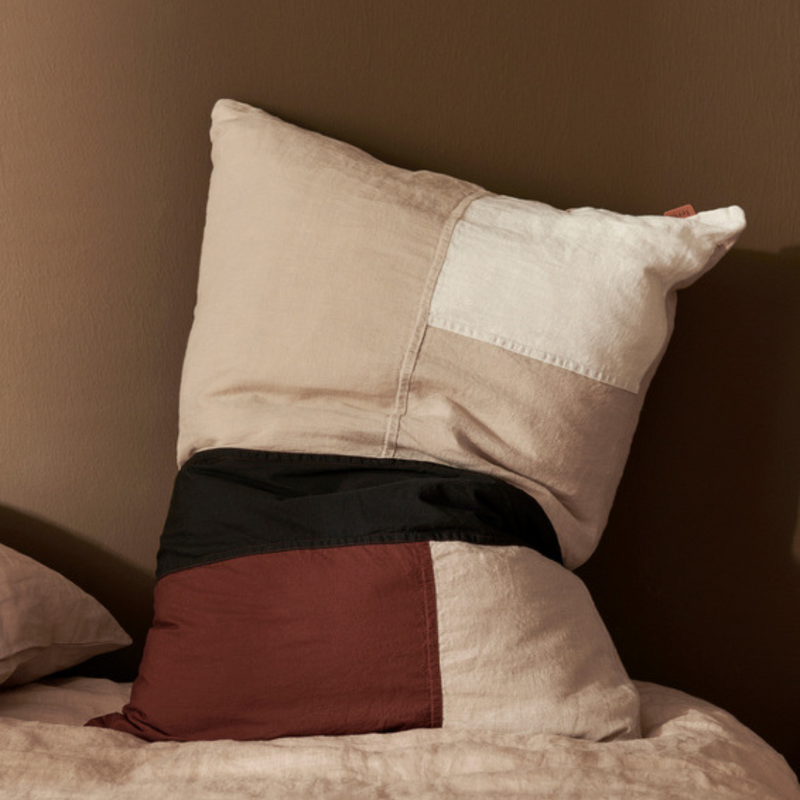 The Part Cushion - Rectangular - Cinnamon is where tactility and coolness meet. Inspired by the traditional Korean Pojagi technique, each cushion features a contemporary patchwork of pure linen and GOTS-certified organic cotton. We love the combination of slightly seethrough linen and cotton in cinnamon, black, and beige tones.