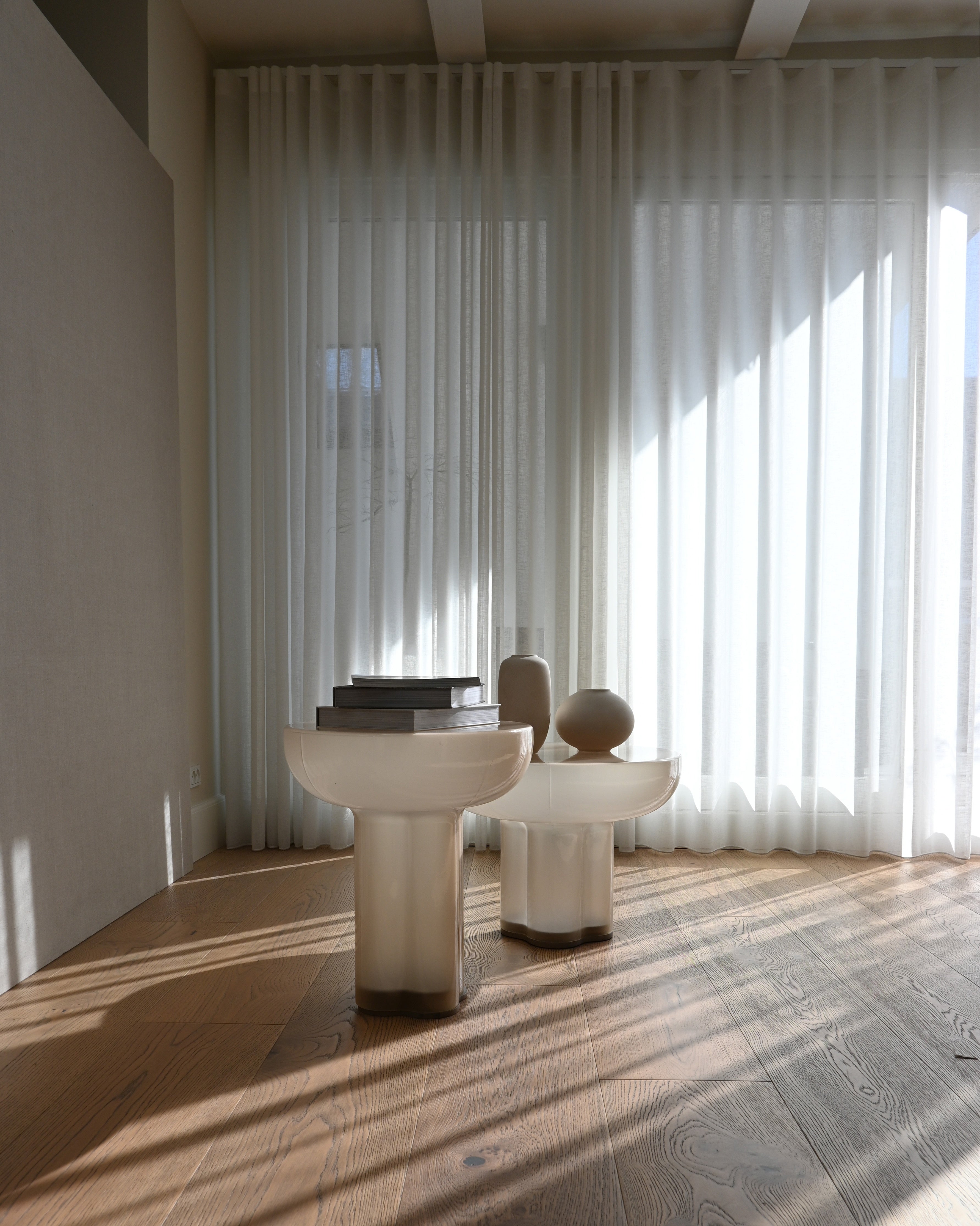 The 101 Copenhagen Crown Tables in Glass blend architectural inspiration with refined craftsmanship. Mouth-blown and sculpted at 1500 degrees, each table features a circular top supported by four cylindrical legs, echoing Brutalist elegance. Available in two sizes and colors, the tempered glass rests on a sturdy wooden base with internal metal reinforcement. Striking yet minimalist, the Crown Table elevates both residential and commercial spaces.