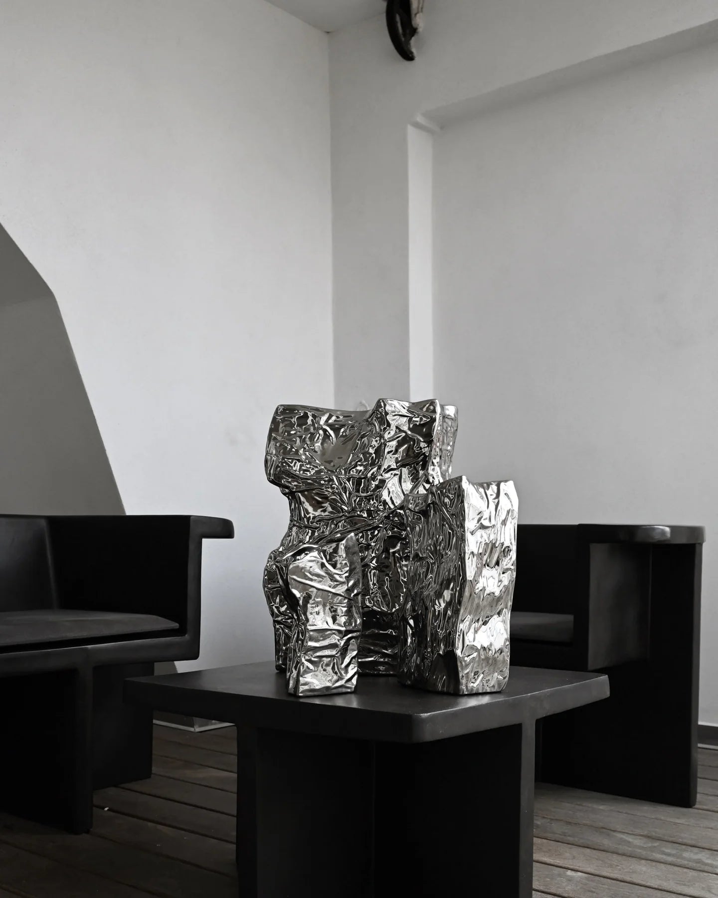 Kami is available in three sizes and two colors. Choose from the clean Bone White, which highlights the texture resembling crumpled paper bags, or the Chrome finish, offering a glossy, mirror-like surface that adds a contemporary touch to your space.