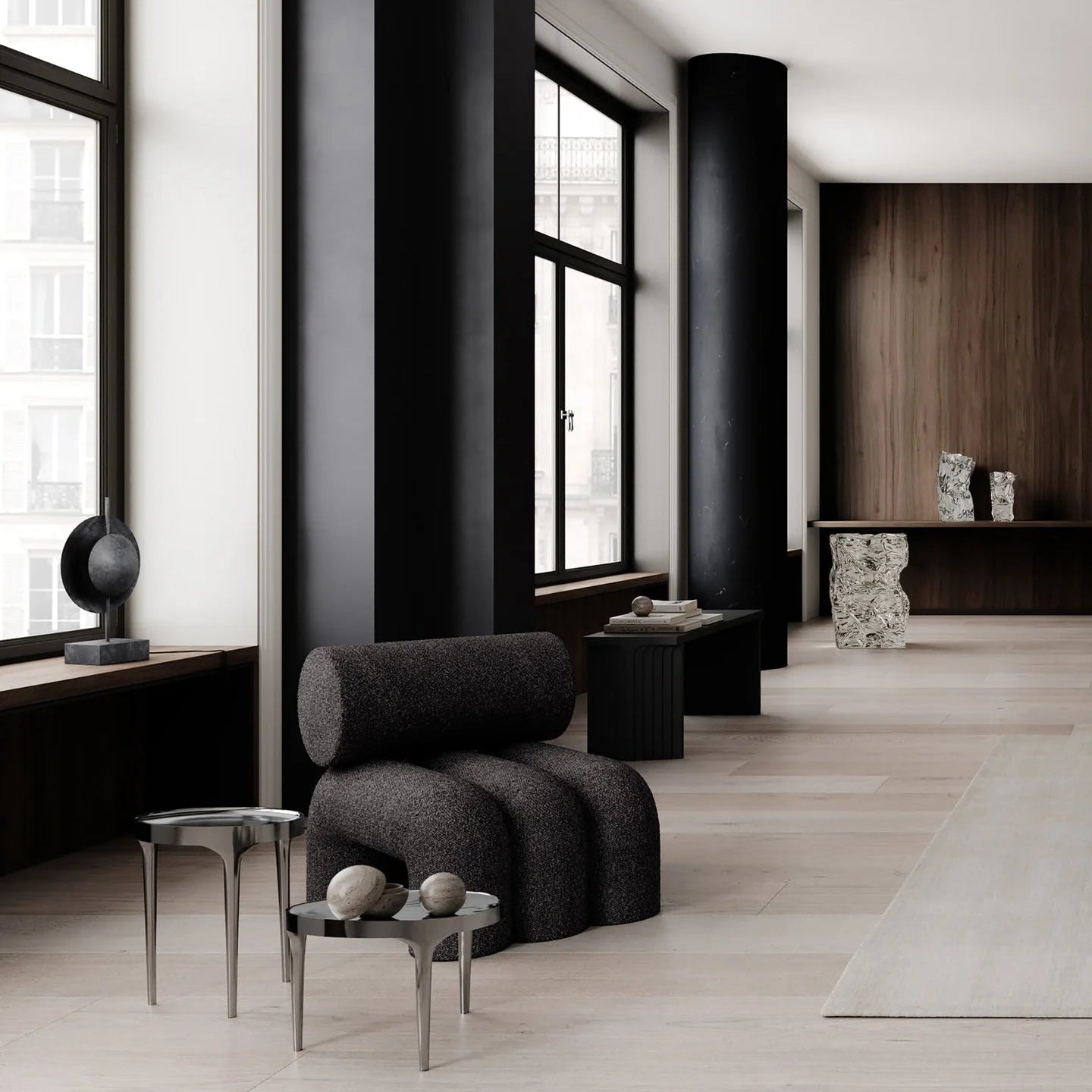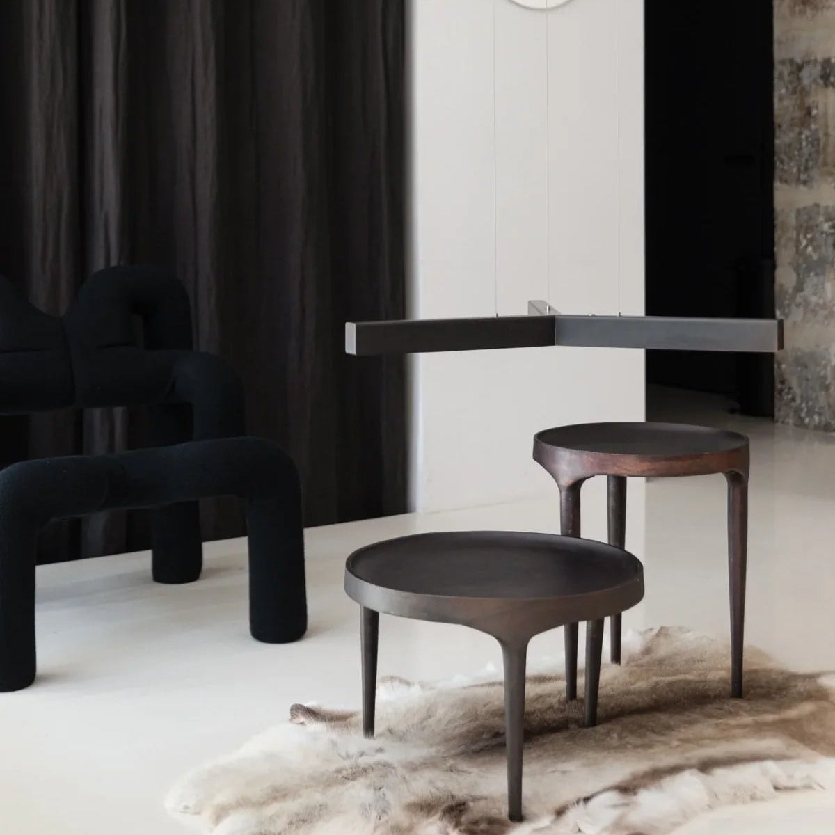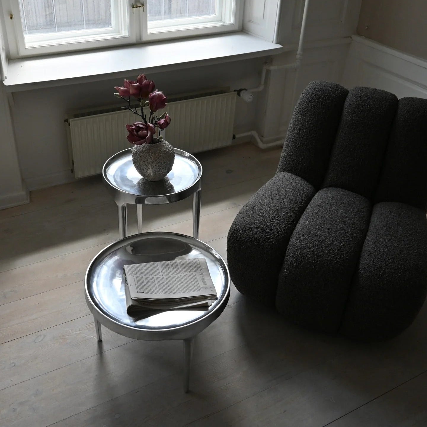 The 101 Copenhagen Phantom Table has an intentional naive, handmade expression. Select from three distinct finishes, each offering a unique character. The hand-painted burned antique variation features a raw, unpolished surface with a warm, subtle glow. The polished aluminum option, finished in chrome, boasts a sleek, mirror-like shine for a modern touch. The newest birch color, hand-painted in soft, natural tones inspired by birch bark, brings an organic and tranquil charm. While each finish enhances the Phantom Table’s artisanal appeal, they all maintain its refined, versatile aesthetic, making it a timeless addition to any interior.