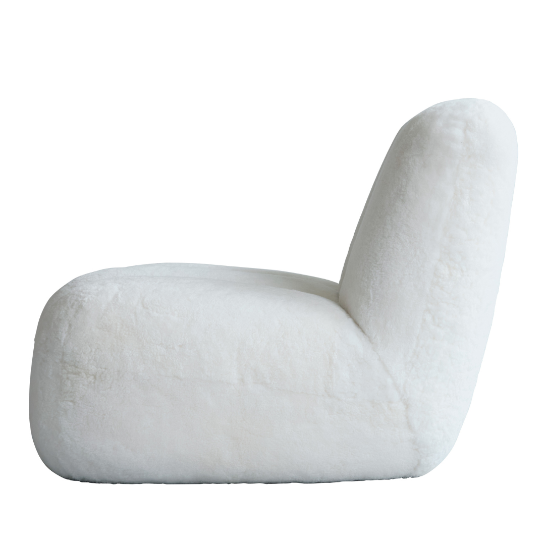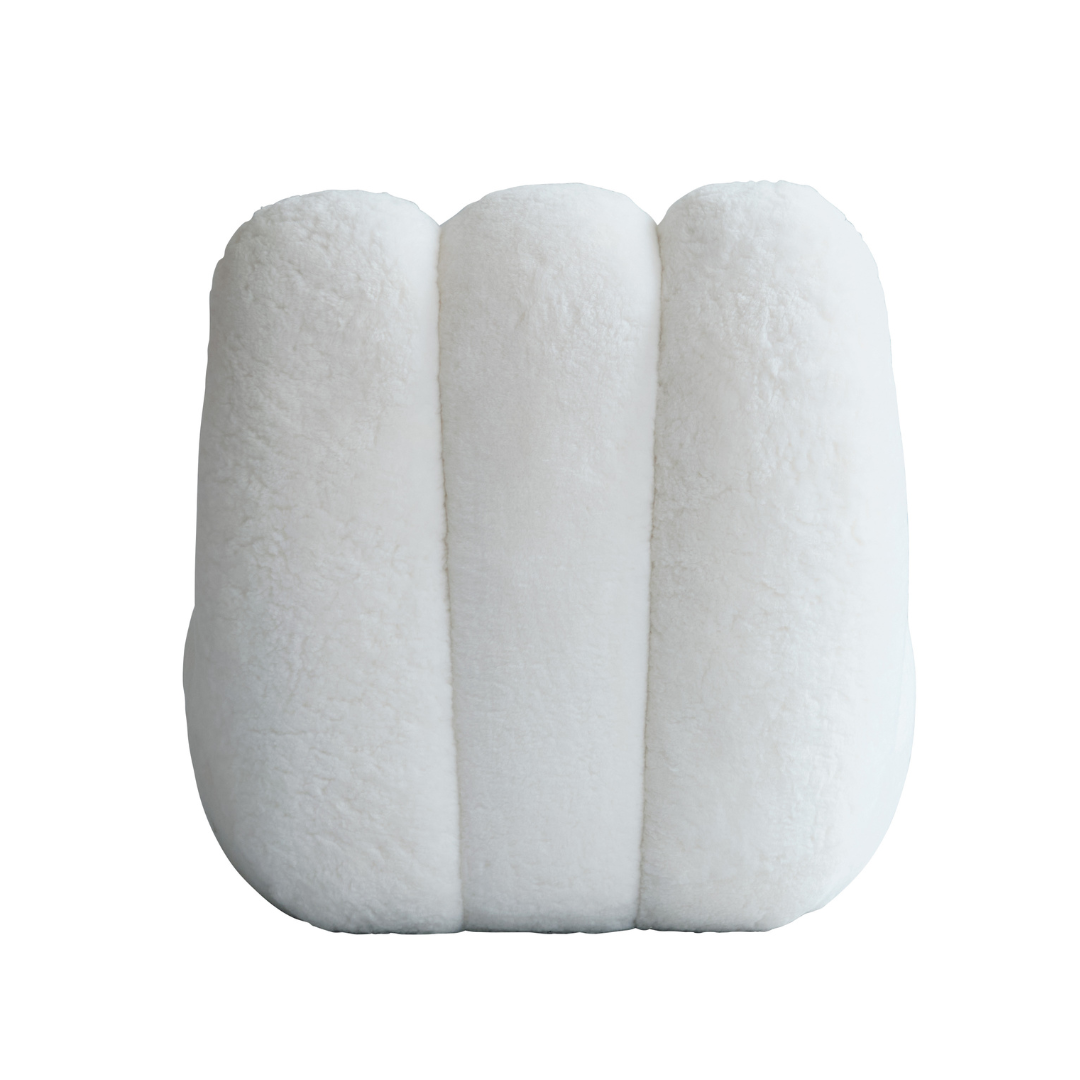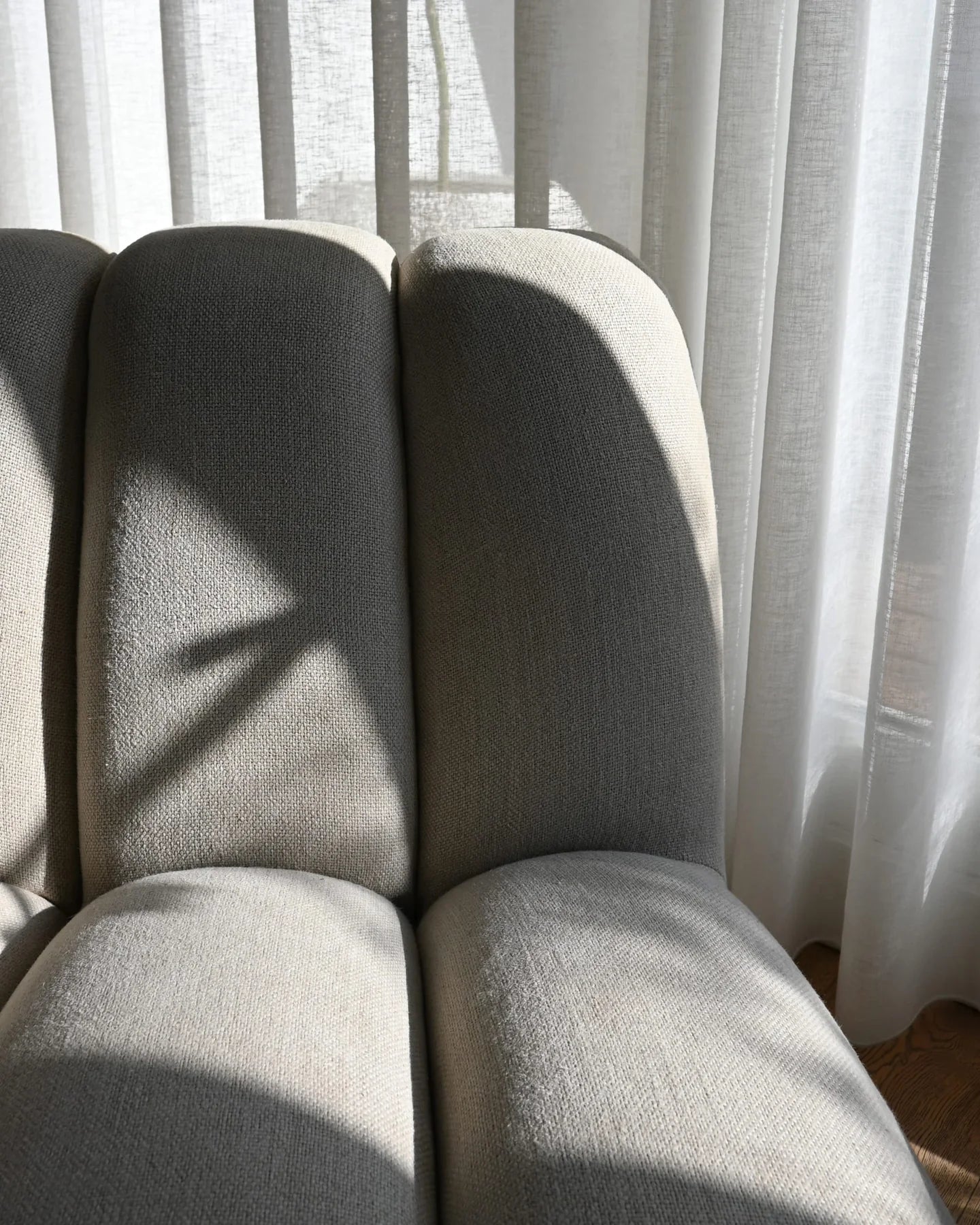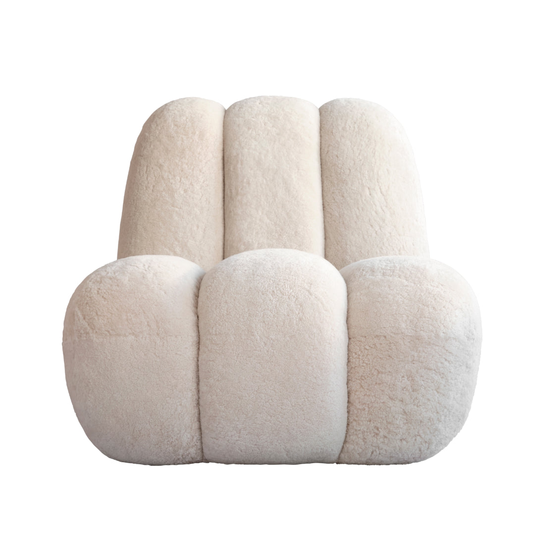 The 101 Copenhagen Toe Chair is a tribute to 1980s futuristic and space age design. The comfortable Toe Lounge Chair takes a sculptural approach to design, with thick fluted upholstery running from the seat to the back, giving it a linear and voluminous shape. The open form of the chair, as well as the special combination of foam, ensures overall comfort. The Toe Chair comes in four upholstery options: Off-White Bouclé, Chalk-Colored Linen, Sheepskin, Nubuck Leather, and a Sunproof Fabric in Taupe.