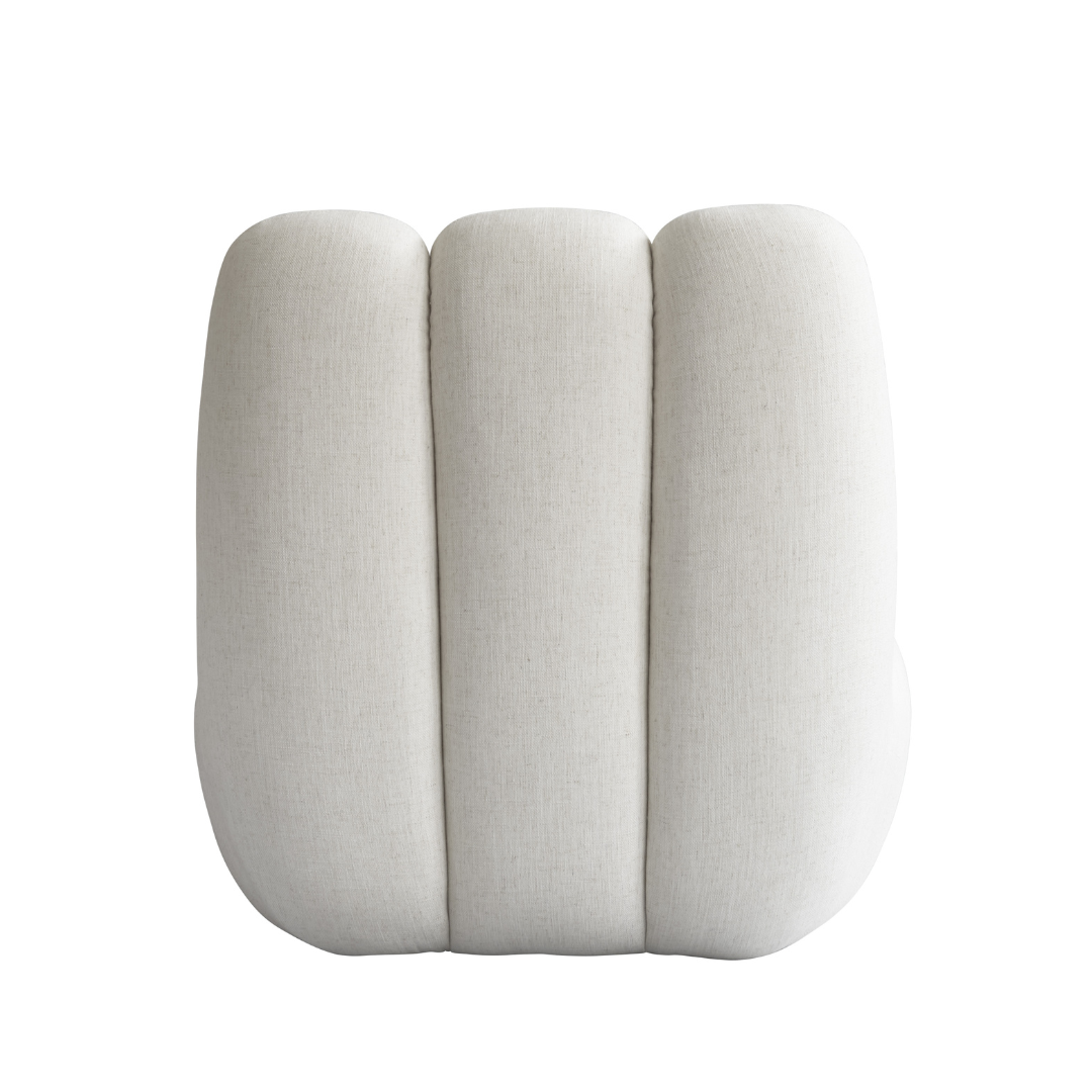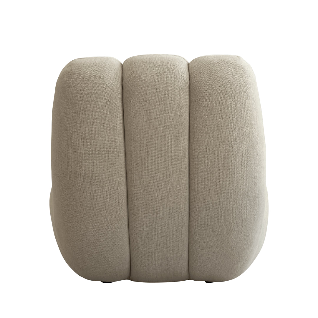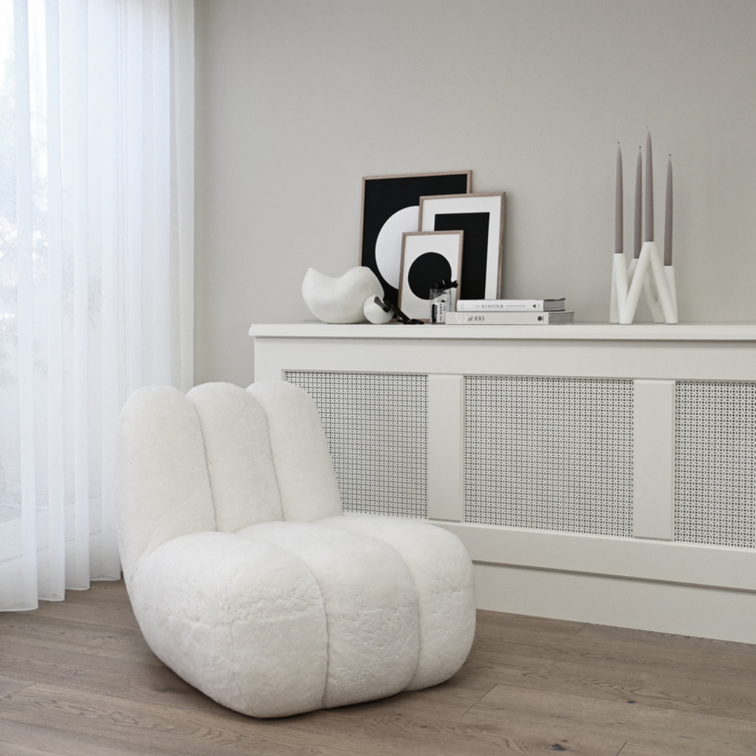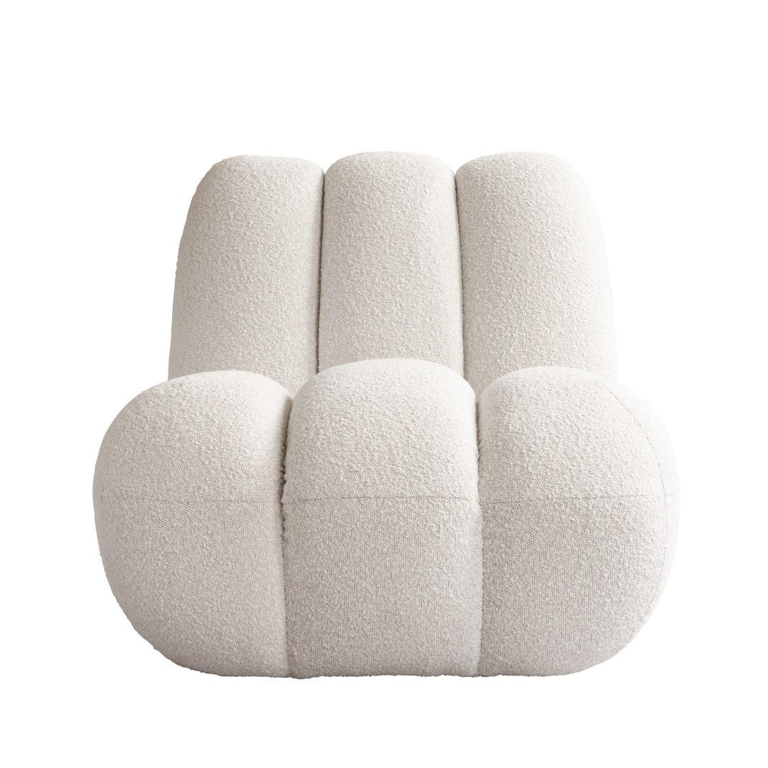 The 101 Copenhagen Toe Chair is a tribute to 1980s futuristic and space age design. The comfortable Toe Lounge Chair takes a sculptural approach to design, with thick fluted upholstery running from the seat to the back, giving it a linear and voluminous shape. The open form of the chair, as well as the special combination of foam, ensures overall comfort. The Toe Chair comes in four upholstery options: Off-White Bouclé, Chalk-Colored Linen, Sheepskin, Nubuck Leather, and a Sunproof Fabric in Taupe.