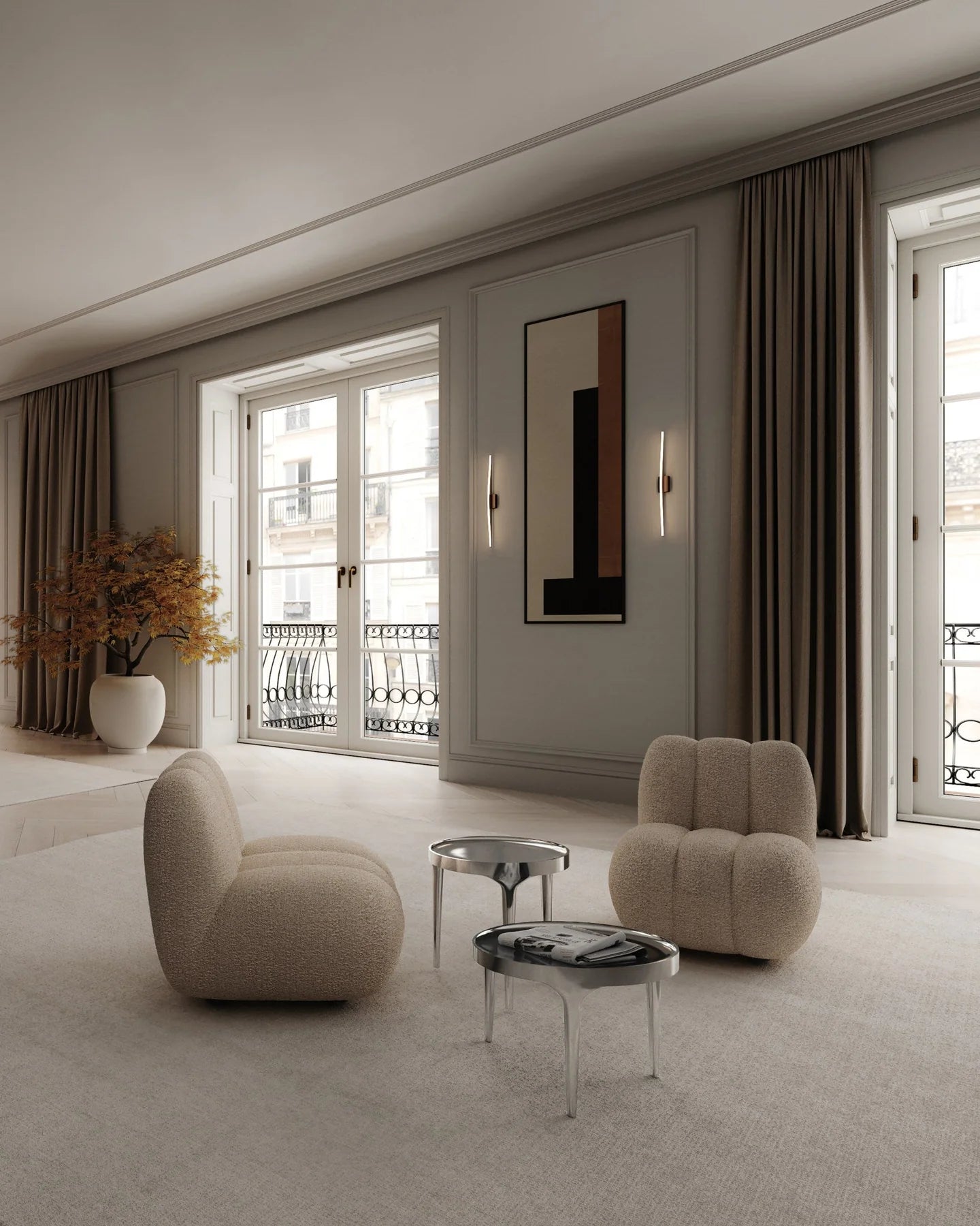 Material: Bouclé, Linen, Deep Taupe Bouclé, Sheepskin, Taupe Sunproof Fabric, Warm Ash Sunproof Fabric, Nubuck Leather