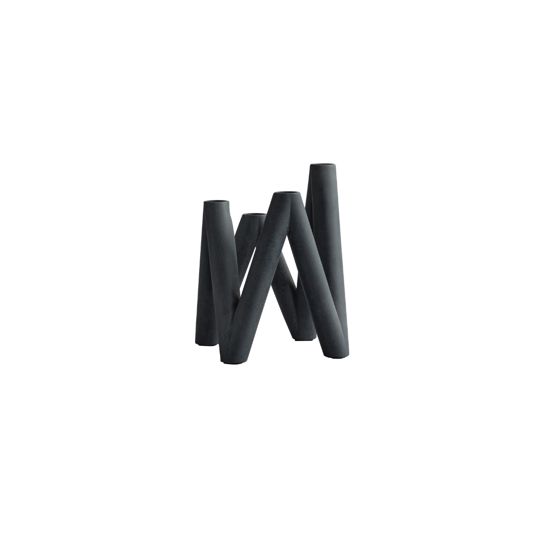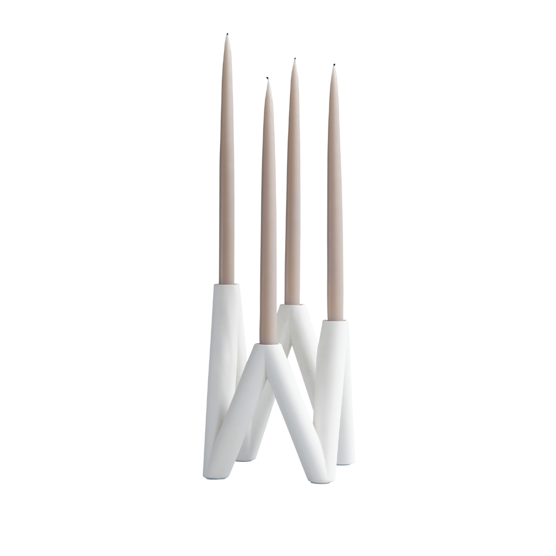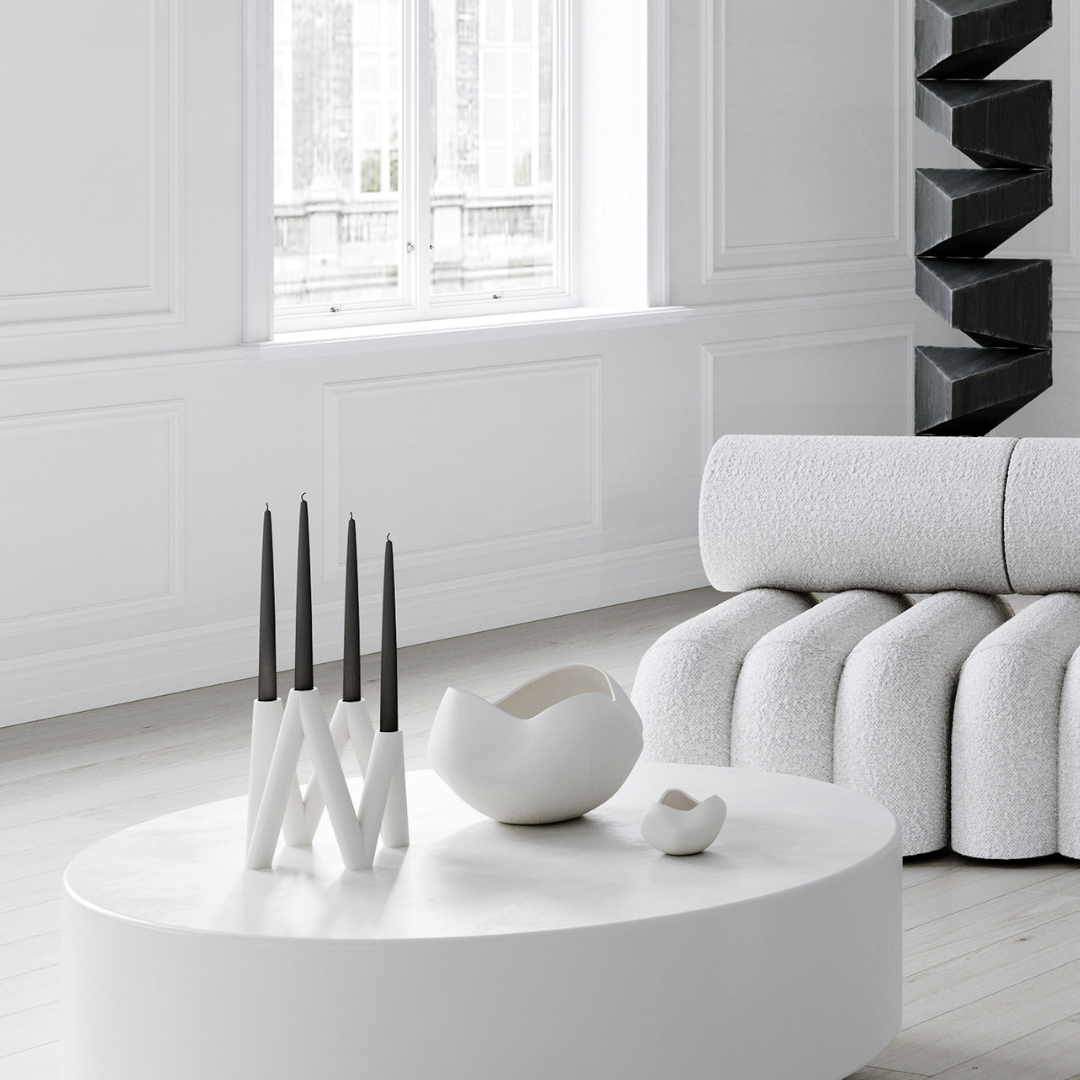 The 101 Copenhagen W Candle Holder features a set of tilting columns that collide in sharp angles, making the shape of a W. Inspired by Brutalist architecture, the design uses different angles and connecting points at different heights for a strong graphic expression. W Candle Holder comes in Black or Bone White, each one holding 4 candles.