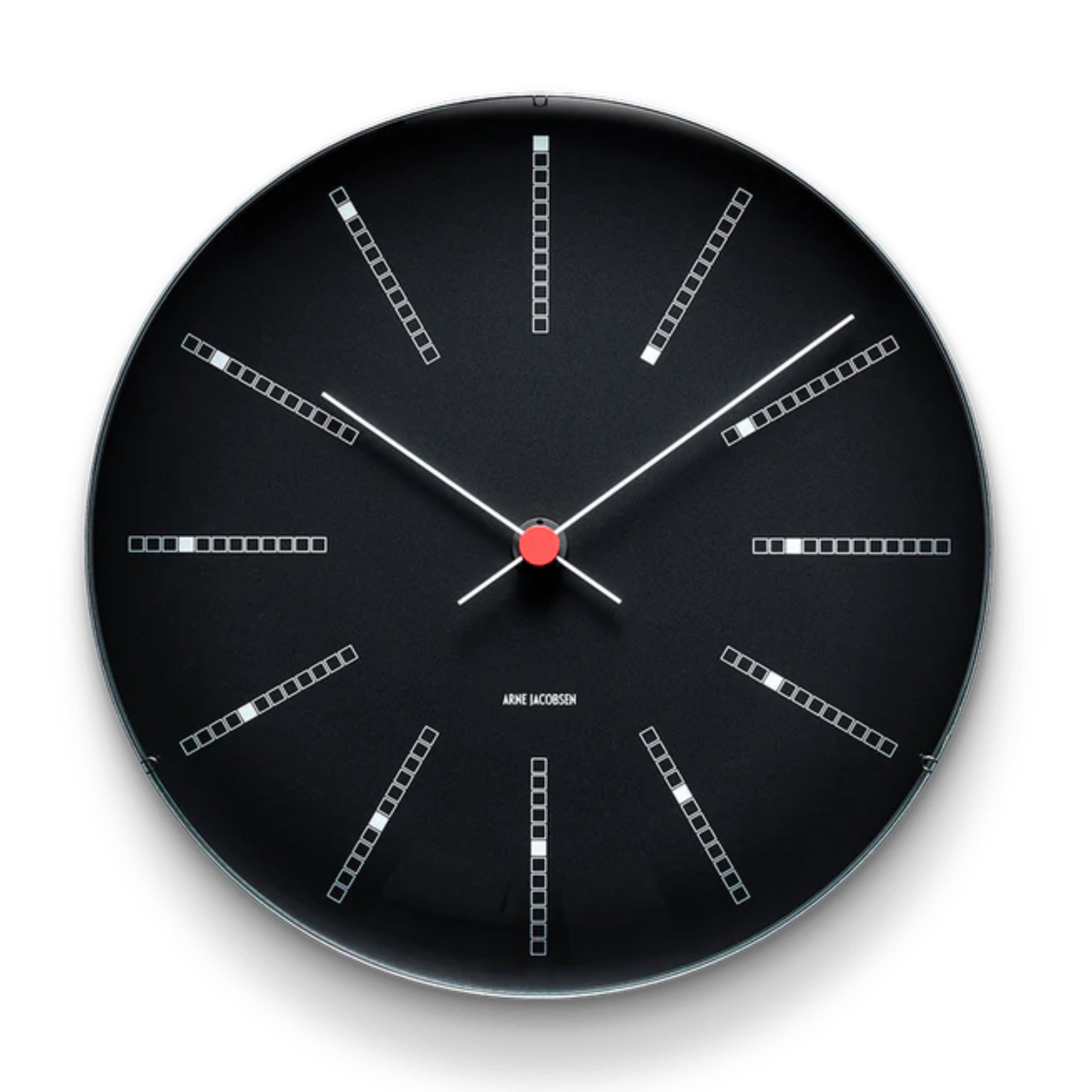 Arne Jacobsen's Bankers Wall Clock in black, designed in 1971 for the National Bank of Denmark, is now available for your home. This timeless design features unique details, like a continuous spiral that elegantly marks the passage of time. Available in two sizes, medium or large, it brings a touch of classic yet modern style to any space.