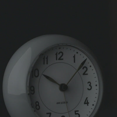 Originally designed in 1939 by Arne Jacobsen for Lauritz Knudsen, the Station Table Clock is a 4.7" tall piece with timeless appeal. It features a snooze function and light sensor, making it a practical alarm clock for the bedroom. The third hand sets the alarm, while its minimalist design with clean lines fits perfectly in any modern home.