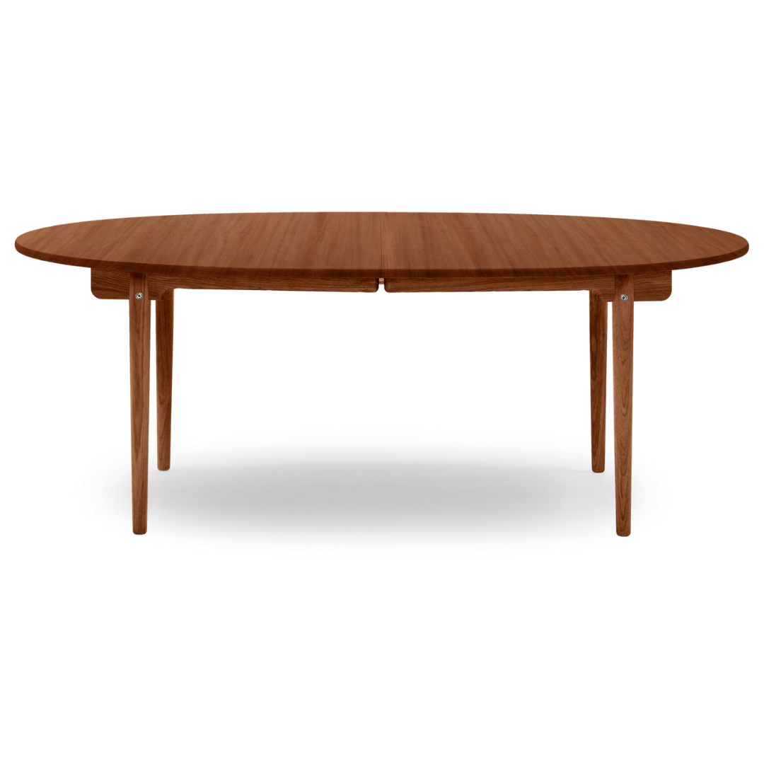 The CH338 Dining Table, designed for 6 people, is a longer version of Hans J. Wegner’s CH337 4-person dining table from 1962. Like the CH337, the CH338 has an elliptical-shaped tabletop that can be extended with leaves when more seats are needed.
