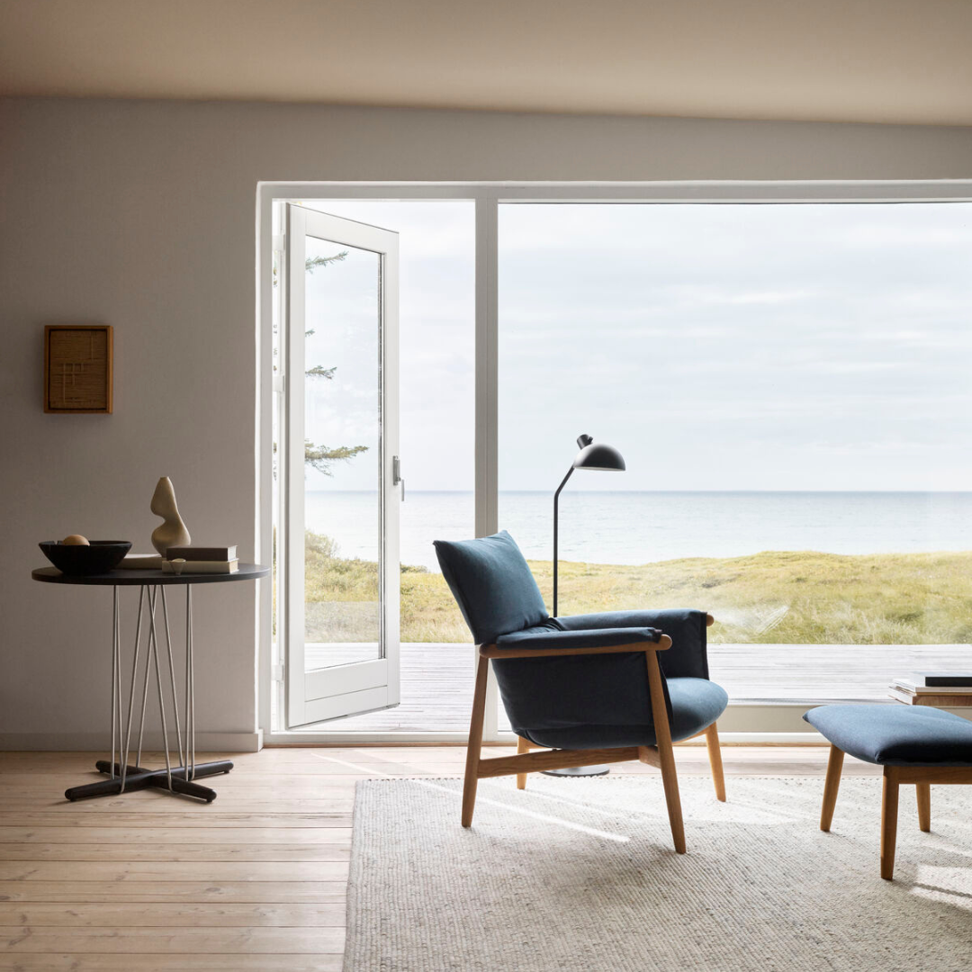 The E016 Embrace Foot Stool pairs with the E015 Embrace Lounge Chair designed by EOOS.