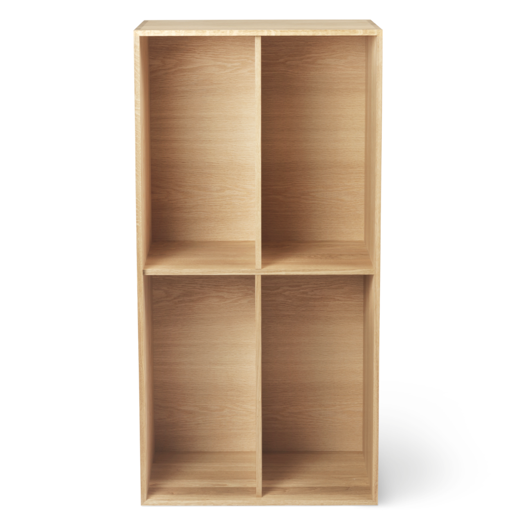The FK63 - Four-Section Upright Bookcase is part of the FK63 Bookcase System, originally designed by Preben Fabricius and Jørgen Kastholm in 1963. The design is a result of a shared interest in functionally minimalist designs that focus on proportion, handcrafted details, and natural materials. Perfect for idiosyncratic displays of functional and aesthetic objects, the FK63 Bookcase System is crafted in FSC®-certified oak in an oiled oak or white oiled oak finish, accentuating the natural texture of the wood. It features thoughtful joinery details including full-width cabinets fitted with brass handles and open shelves with optional sliding trays––both of which are customizable––to accommodate growing collections. FK63 comes in wall-mounted and standalone versions. The floor-standing versions rest on a slender powder-coated metal frame.
