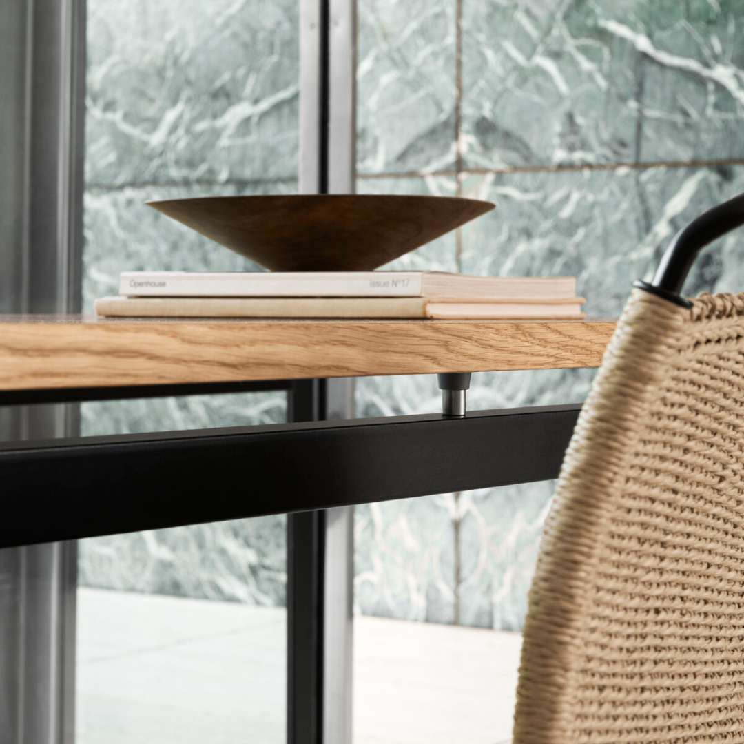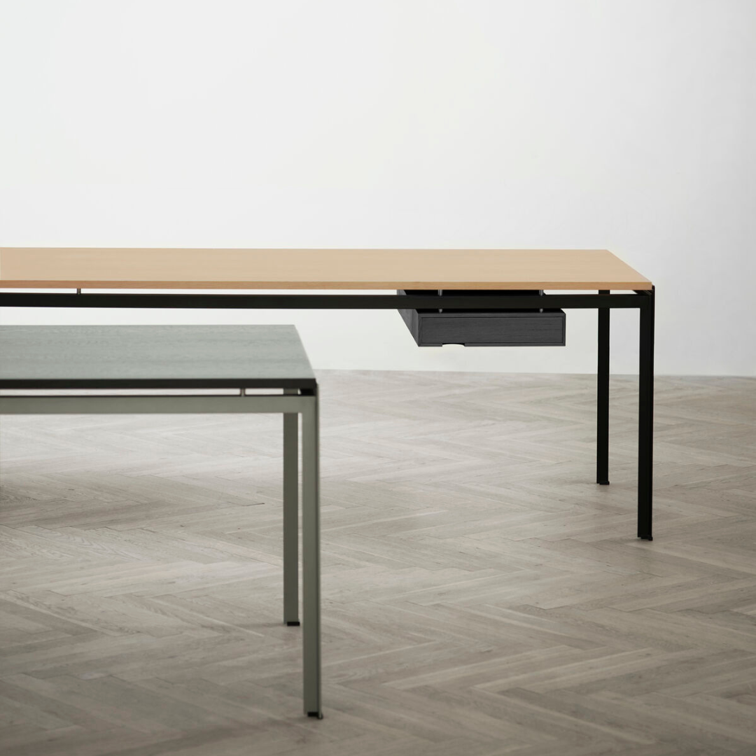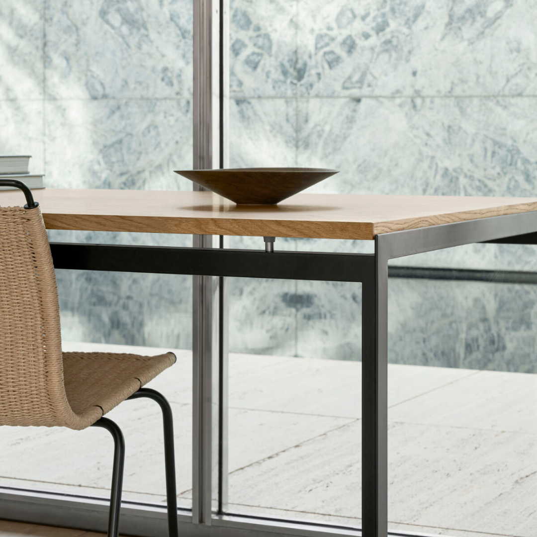 The PK52A Student Desk was designed by Poul Kjærholm when the Royal Danish Academy of Fine Arts needed working space for lecturers and students. Drawing on his cabinetmaking experience, Kjærholm developed a new table structure that showcased his mastery of steel and wood. Metal ferrules separate the steel and wood to lend this desk a dynamic, light look.