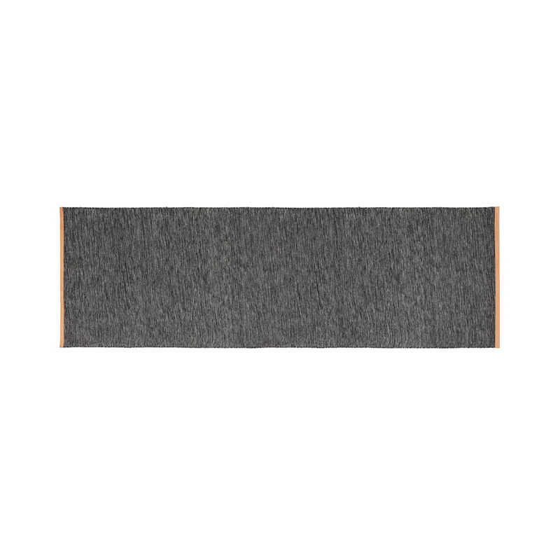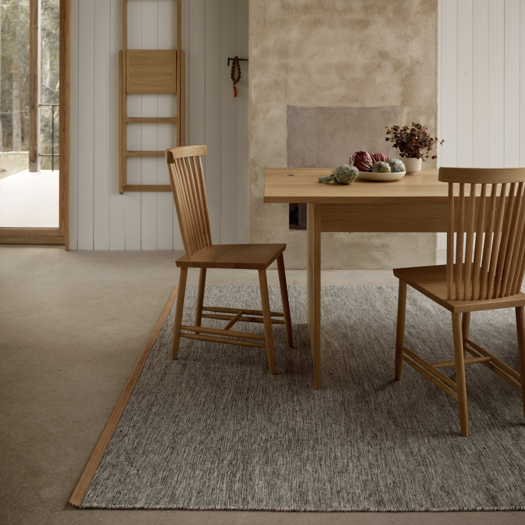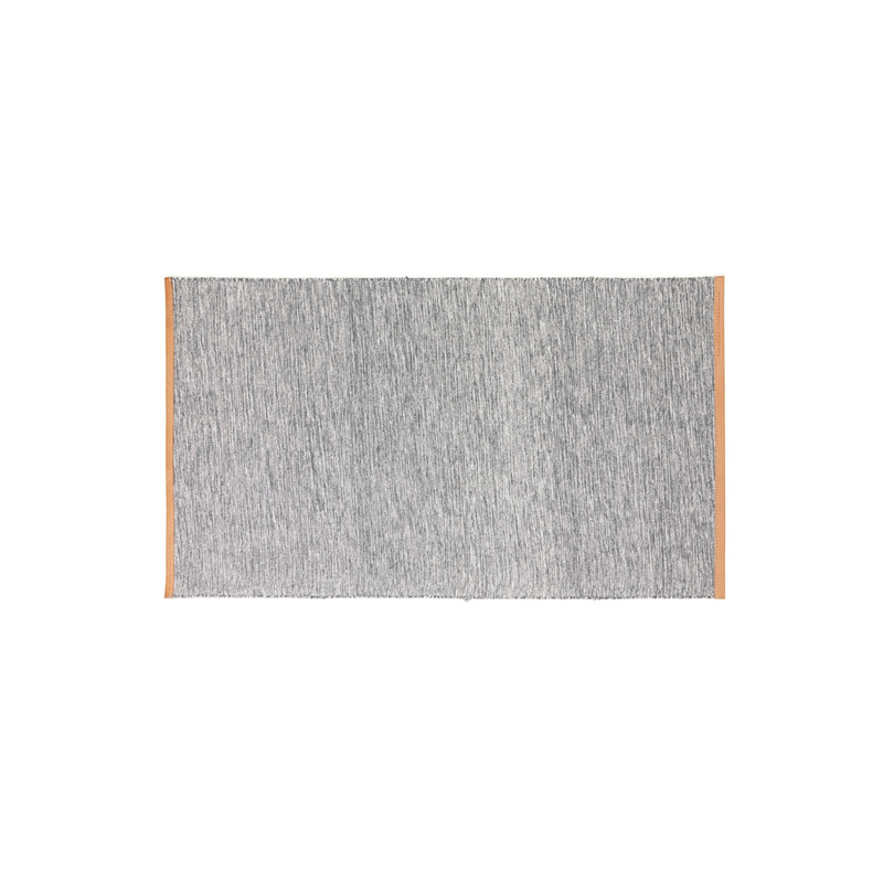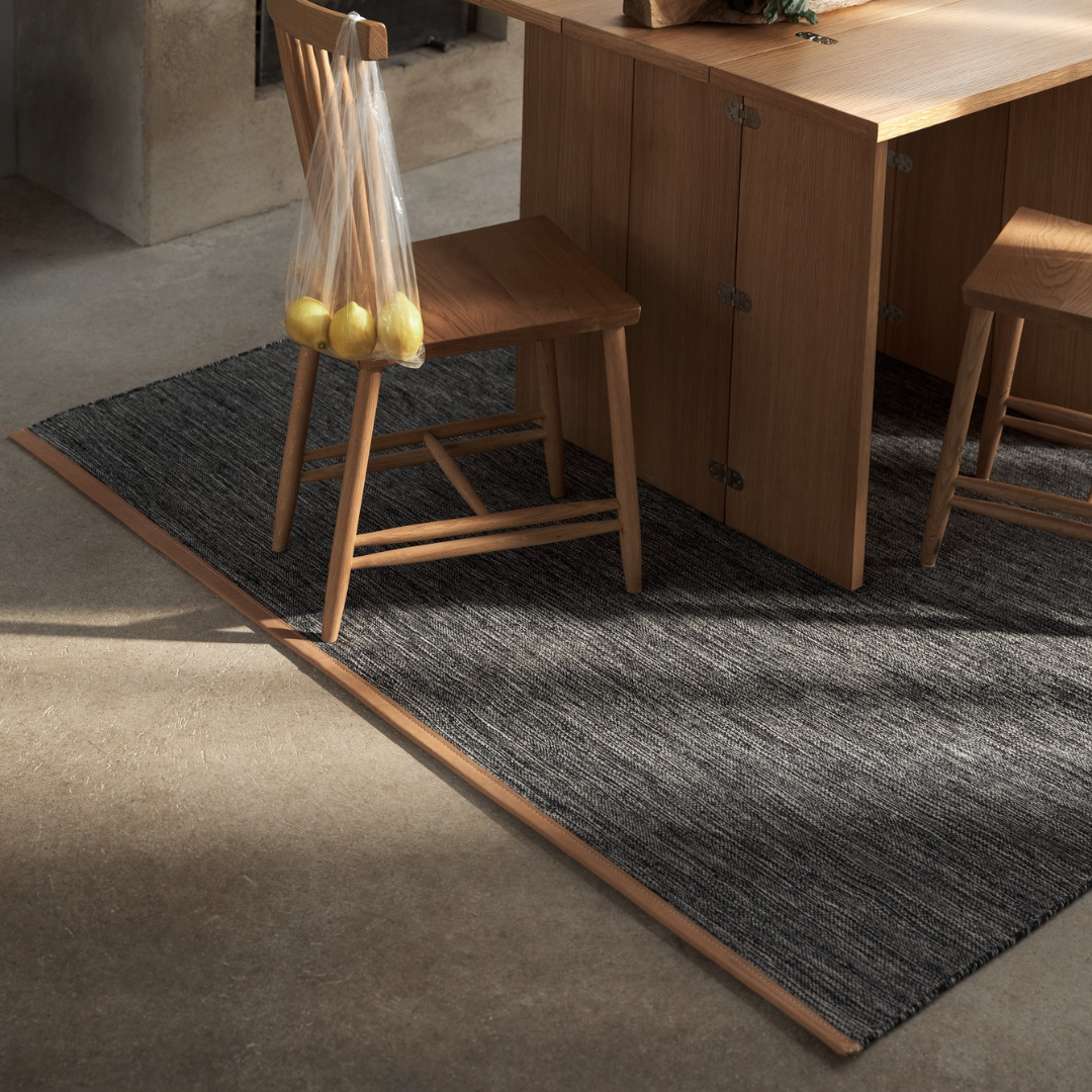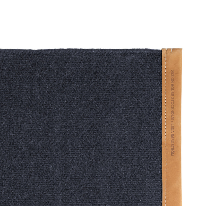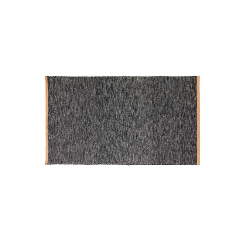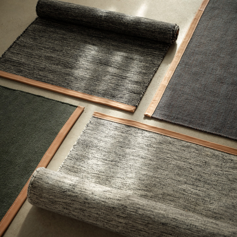 Meet the Björk Rug. The Björk collection is based on a weft in wool contrasted with leather details. Wool is both soft and resistant to soiling thanks to its natural oils. The woven pattern is inspired by the black and white trunk of the birch tree (which in Swedish is Björk). The marbled effect is made by intertwining different colored wool yarns in the weft.