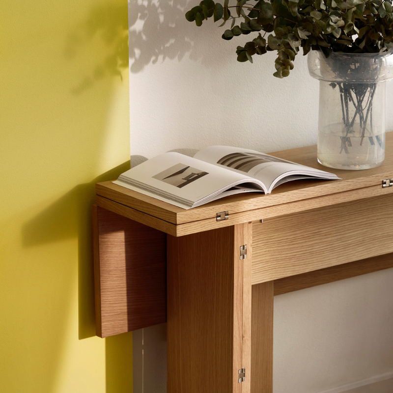 You'll find 14 hinges that enable the table to fold many different ways, giving the table a different aspect and presentation depending on how it's set up. The legs fold behind each other and part of the table top folds upwards while a side folds down, forming different surfaces which provide character and multiple uses.