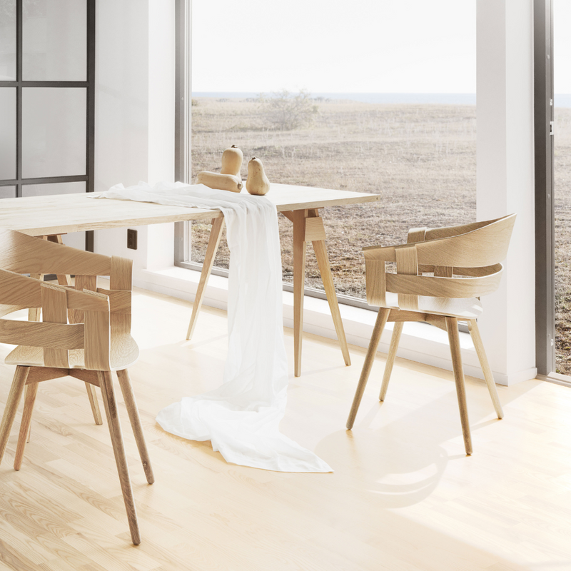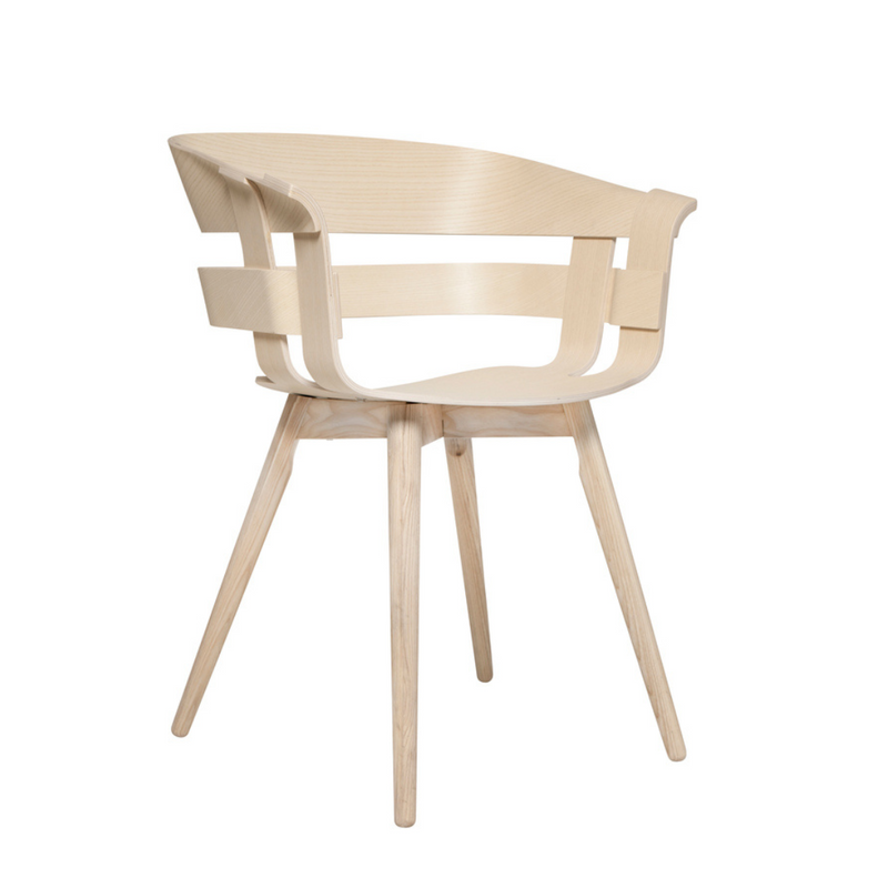 The Wick Chair with Wood Legs is a modular shell chair inspired by the shape and appearance of traditional Swedish woodchip baskets. This ergonomic chair features a solid oak/ash frame.