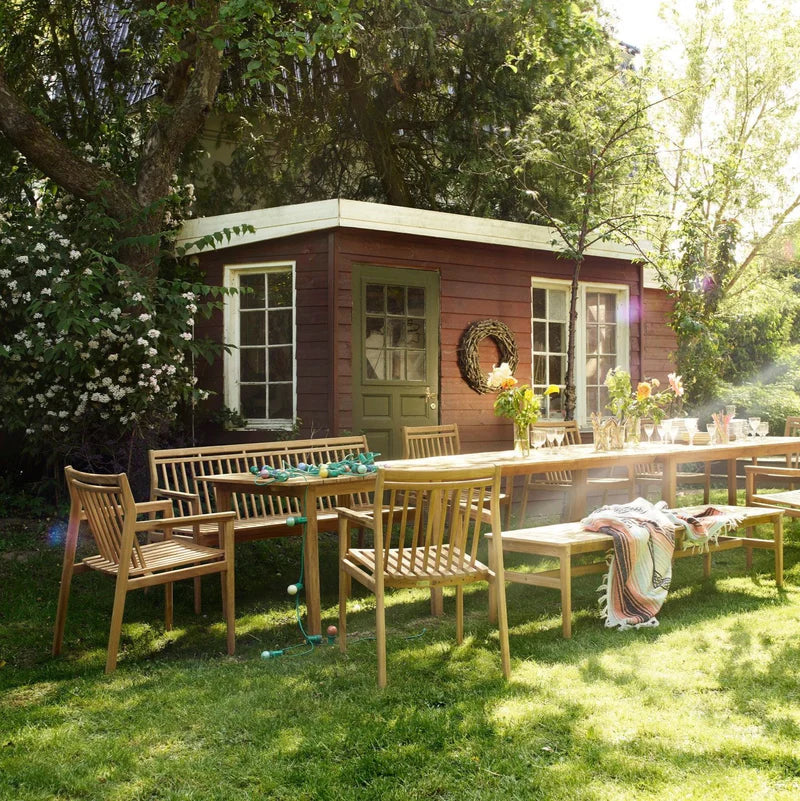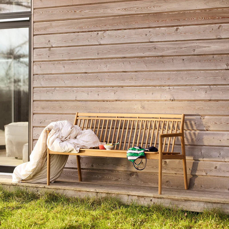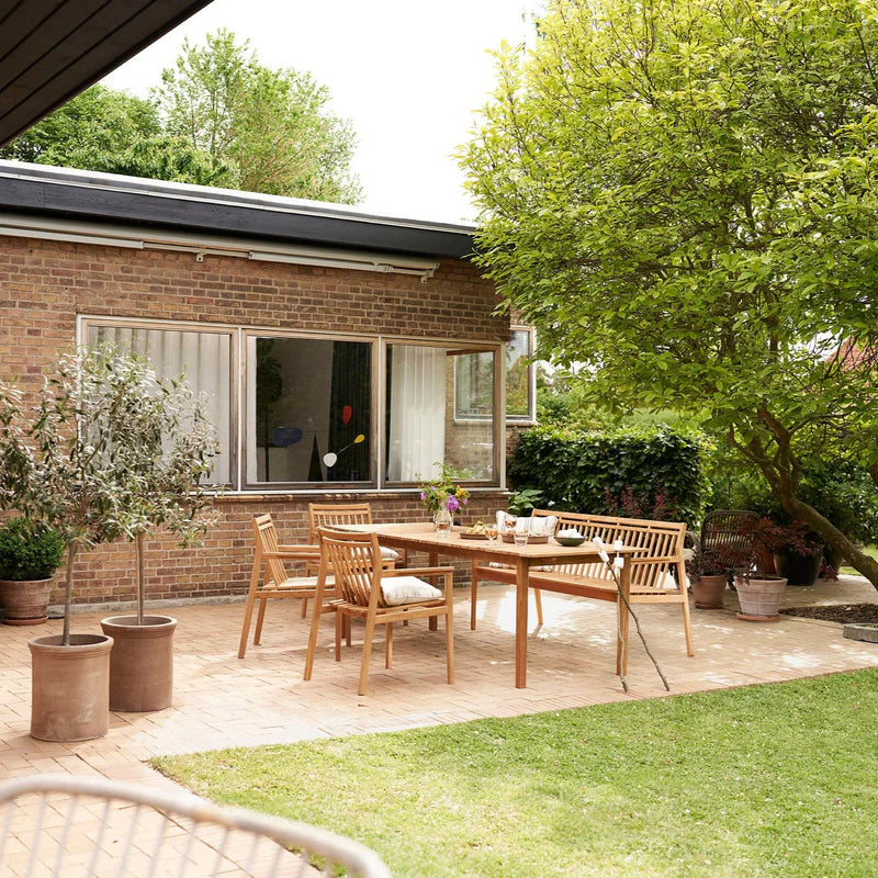 The M11 Sammen 3-Seater Bench with Backrest by FDB Møbler offers flexible outdoor seating with timeless design. Made from natural oiled teak, it features thoughtful detailing that reflects the brand’s heritage of quality craftsmanship. Ideal for adding extra space at the garden dining table or for creating a peaceful spot elsewhere in the yard, the bench pairs perfectly with the M2 dining table and matching chairs in the Sammen Series.