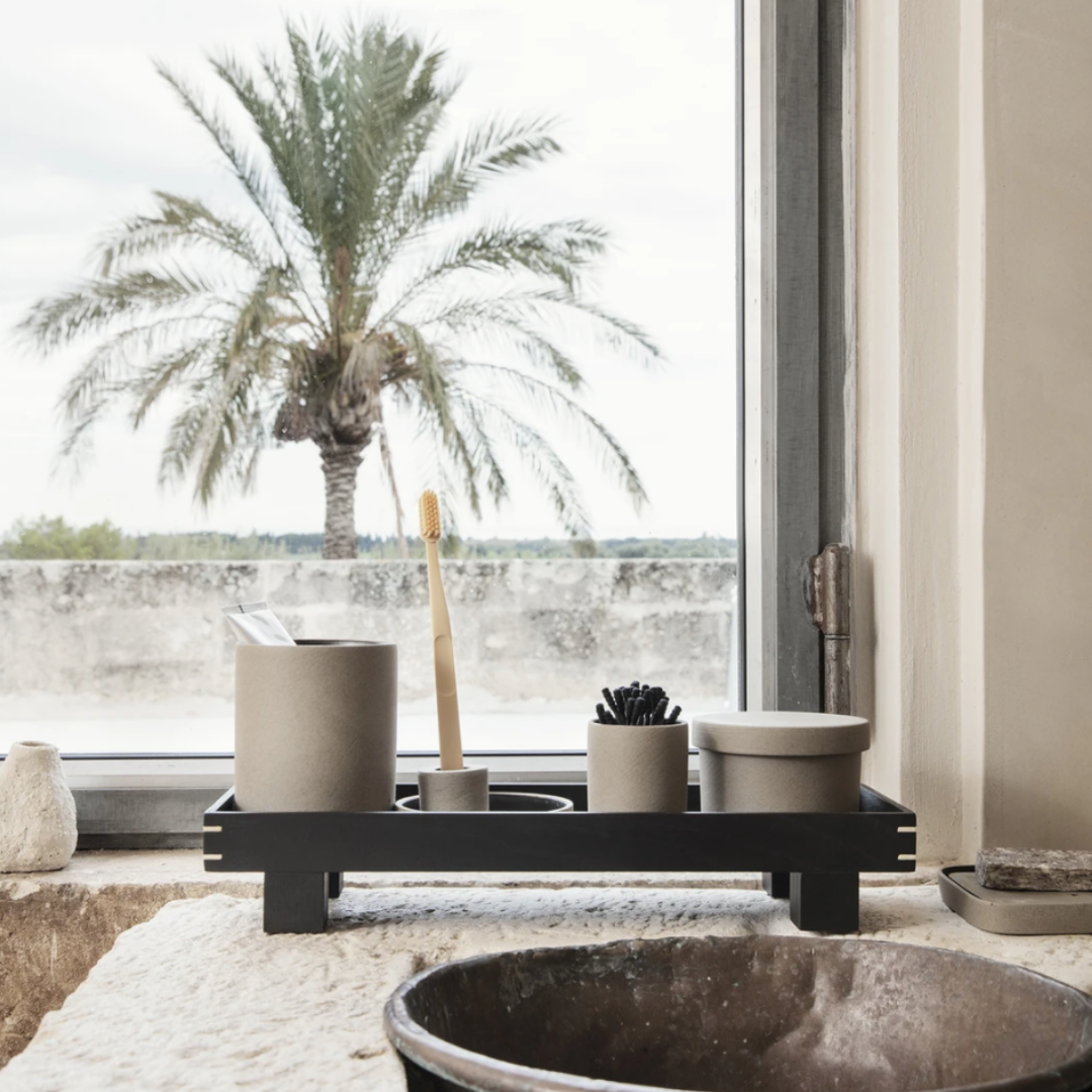 The Ferm Living Bon Accessories Small Cup is a striking porcelain vessel that pays homage to Japanese minimalism using both raw and glazed textures. Its gritted surface showcases the natural beauty and modern design allows the Bon Accessories Container to function in many spaces throughout the contemporary home including the bathroom or home office.