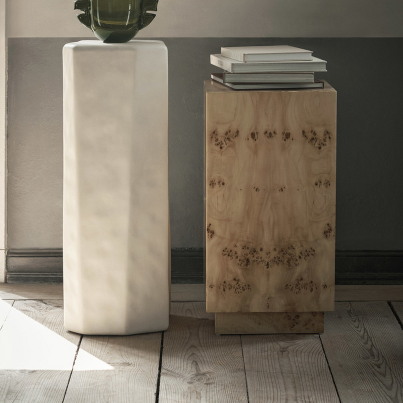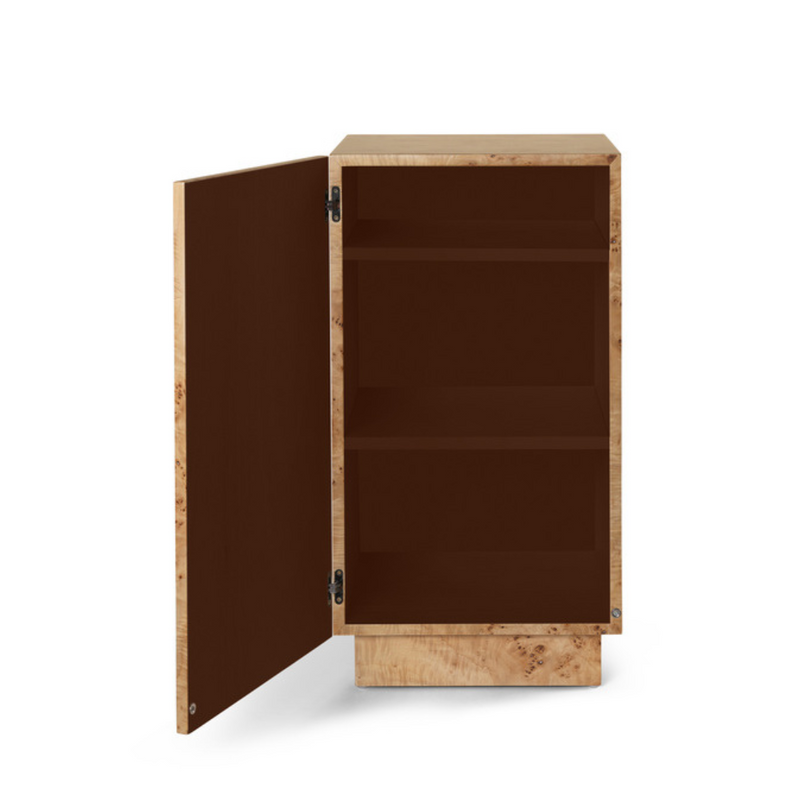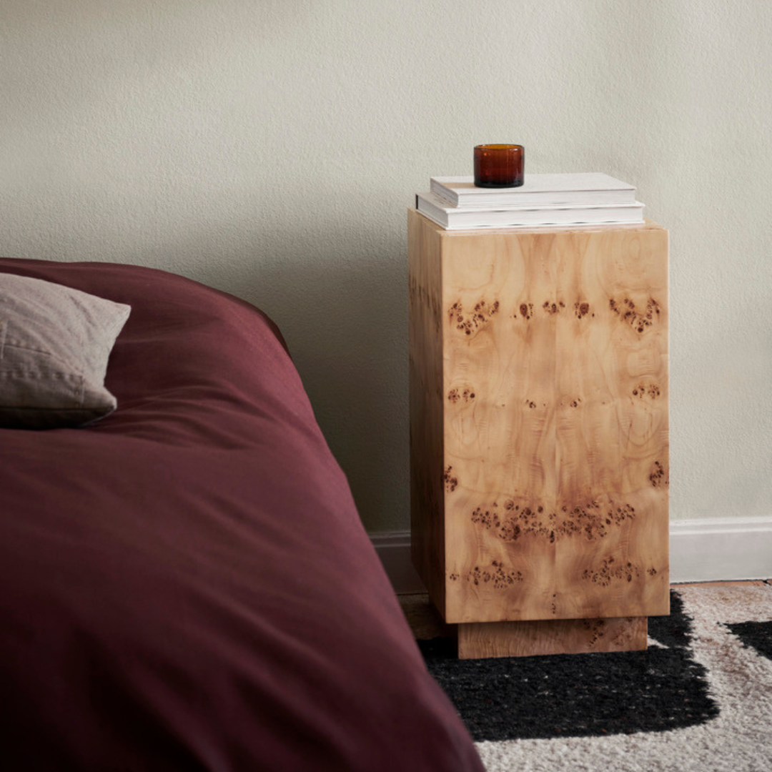 The Burl Side Table is named after the materials used to create it: the beautifully patterned FSC™ certified burl wood. This versatile and sleek piece features hidden storage space with an adjustable shelf. The pedestal-like design exudes an elegant expression that enhances the overall aesthetics and ambiance of any space. We love it as a side table or nightstand.