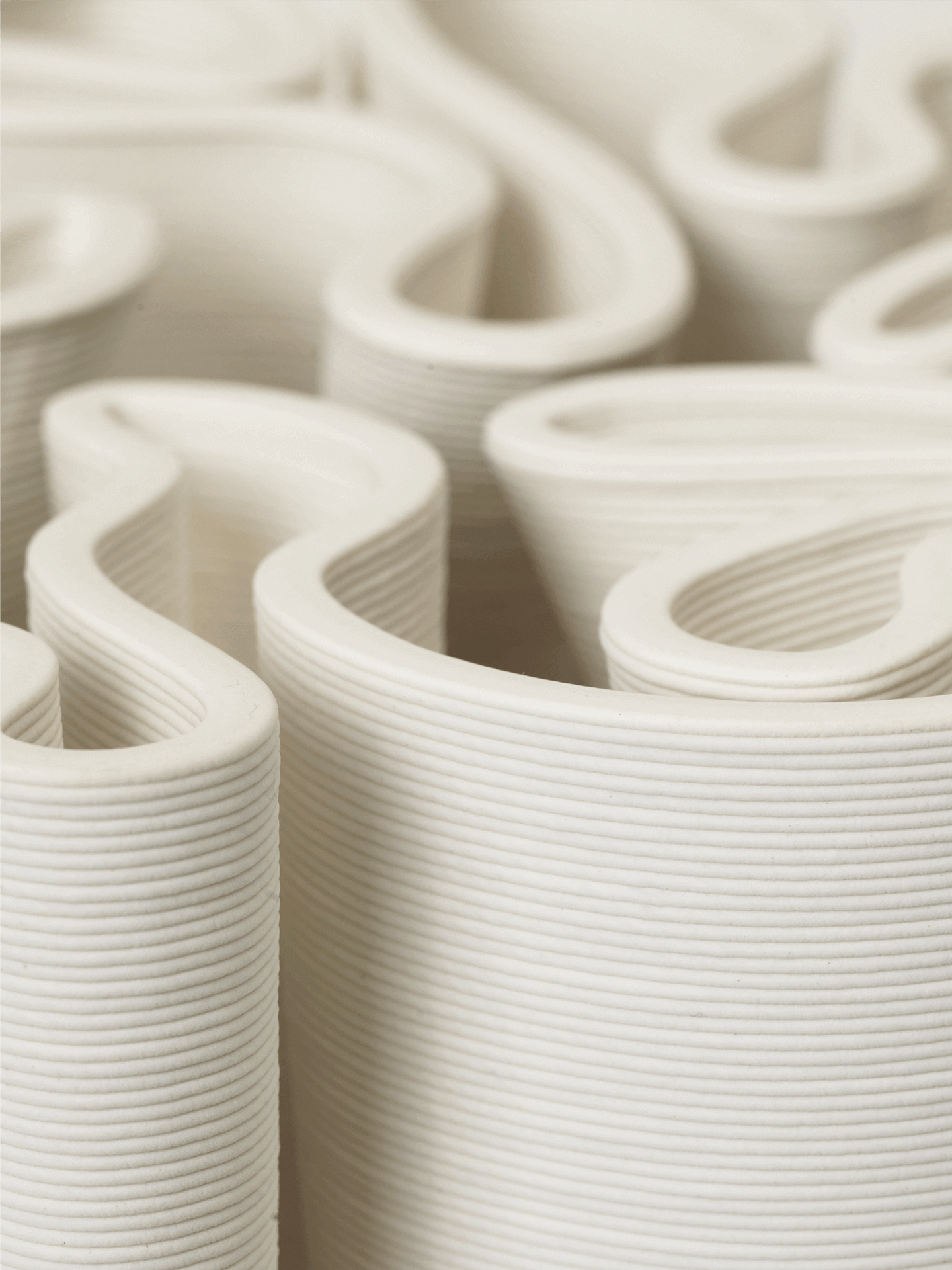 Reflecting the intricate patterns reminiscent of a 'Dédales' or labyrinth, the Ferm Living Dedali Vase seamlessly blends artistry with functionality. Crafted from 3D-printed ceramic, its labyrinth-like top serves both aesthetic and functional purposes, allowing for the arrangement of flowers in a generous, Ikebana-inspired style.