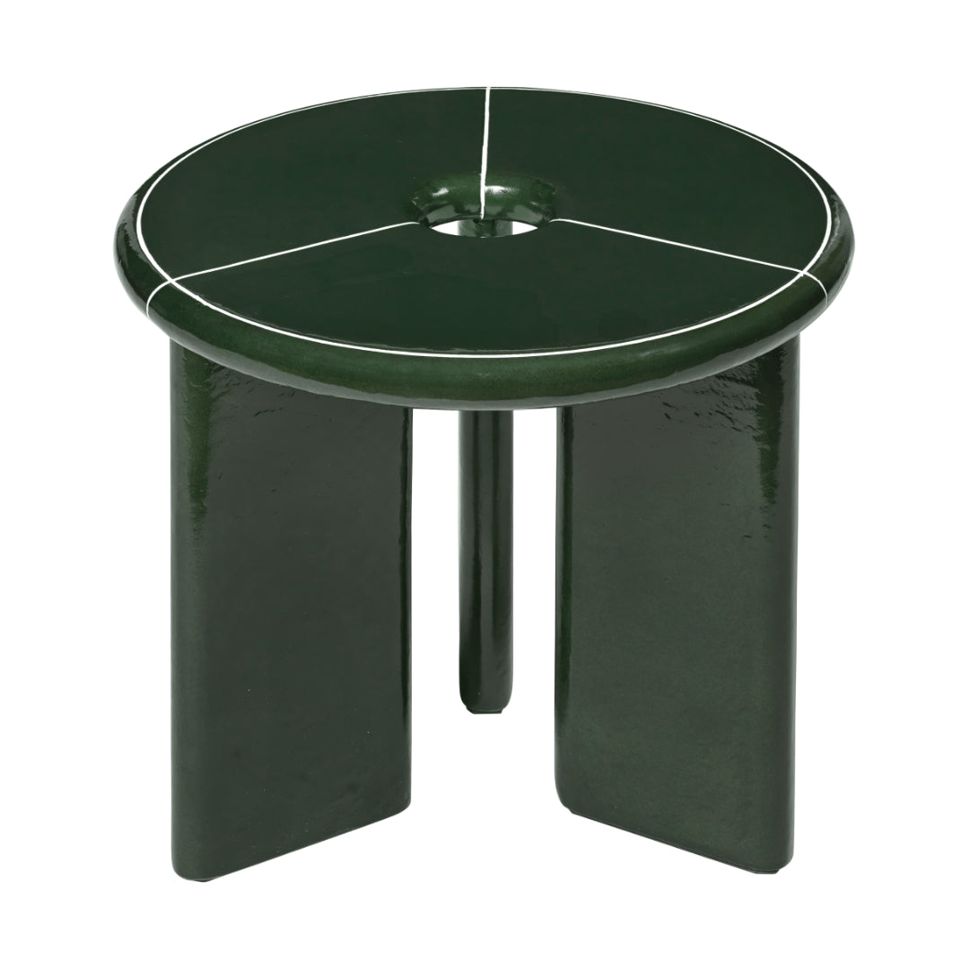 Made from fiber concrete, the Ferm Living Deya Side Table showcases a deep green glazed finish with a textured, organic surface, highlighted by contrasting off-white grout lines. Its segmented tabletop creates a striking geometric aesthetic, softened by smoothly rounded edges. Blending artisanal craftsmanship with bold design, this versatile table suits both indoor and outdoor settings.