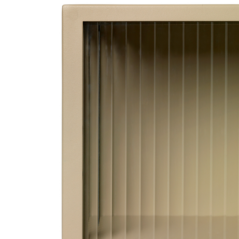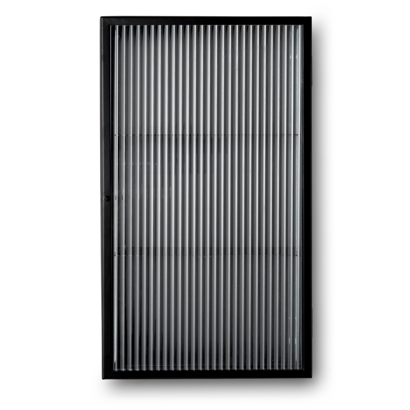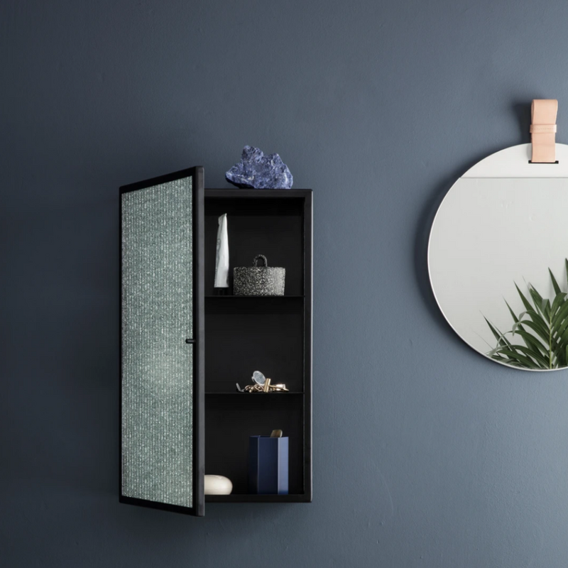 The freestanding Haze Wall Cabinet in Black has a smooth, black powder coated metal finish with wired glass while the Cashmere color features a beautiful ripple glass. Both glass features create the signature "haze" of the collection. This glass is not quite see-through, as it's unique design blurs out it's contents.