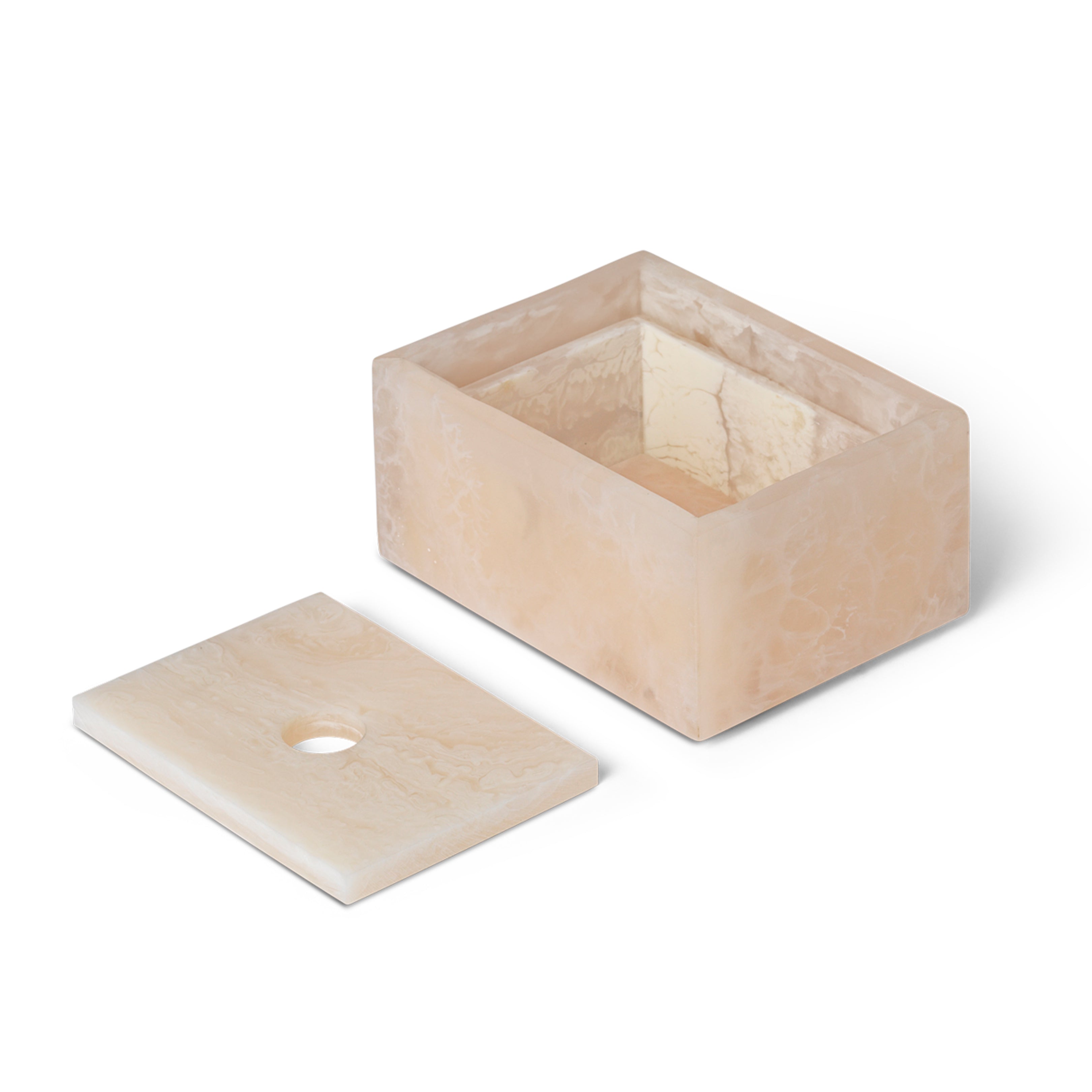 Ideal for bathroom storage, stationery, or as a treasure box, the lid fits seamlessly onto the base, featuring a small cut-out for convenient access. Available in multiple sizes and sold individually, the Mist Box adds elegance and style to various home storage needs.