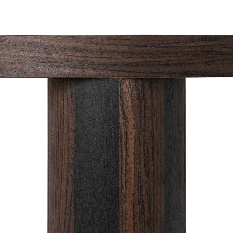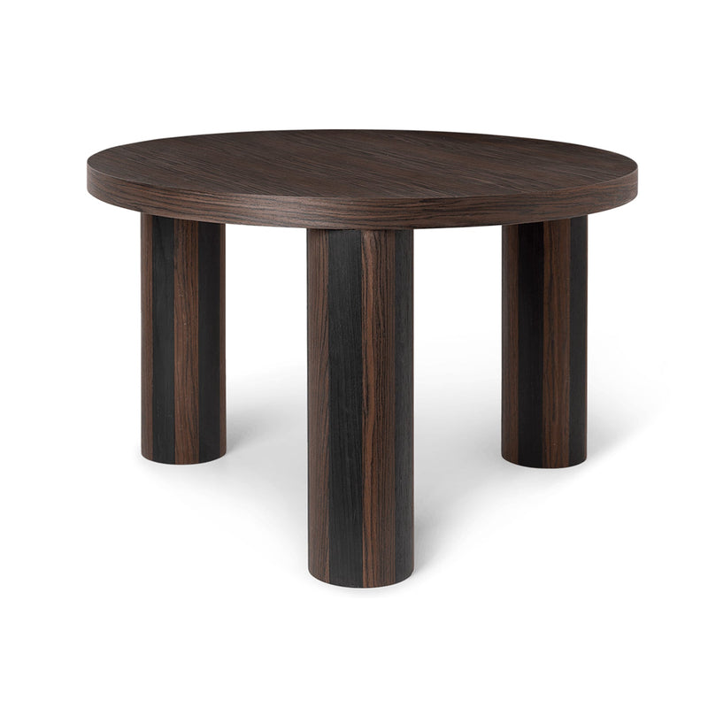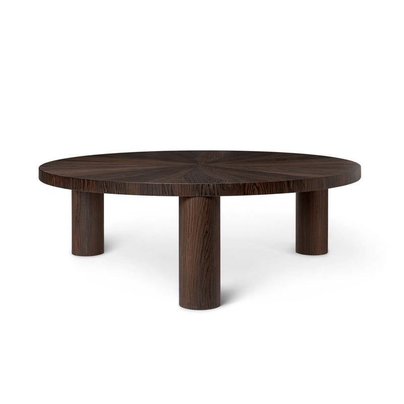 The Ferm Living Post Coffee Tables are inspired by brutalism architecture and design. Playing with volume and oversized forms, this modern coffee table presents a simple, round design with intricate details that are visually appealing a simple in form. Made from FSC™-certified wood, the table has three robust cylindrical legs, while the tabletop features an elegant, unique oak veneer paneling in the shape of spherical sectors, achieved by a technique known as marquetry. Use multiple tables in different sizes to create a cohesive landscape in two levels.