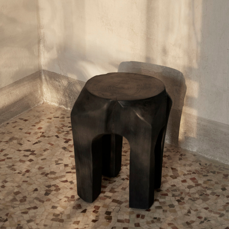 Bring a raw and organic element into your space with the Root Stool. Each stool is made from a single teak tree root, which is often considered leftover or waste material at the sawmills where teak is processed. Once the root is extracted, it's hand carved into the shape of a stool and then stained black. Use it as additional seating around the coffee table, in the hallway, or as a beautiful side table in any living area.