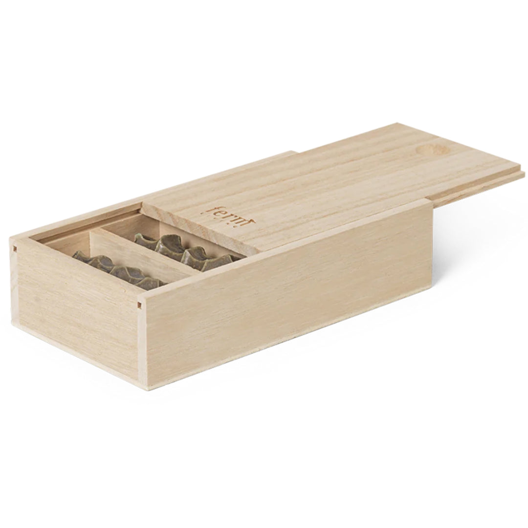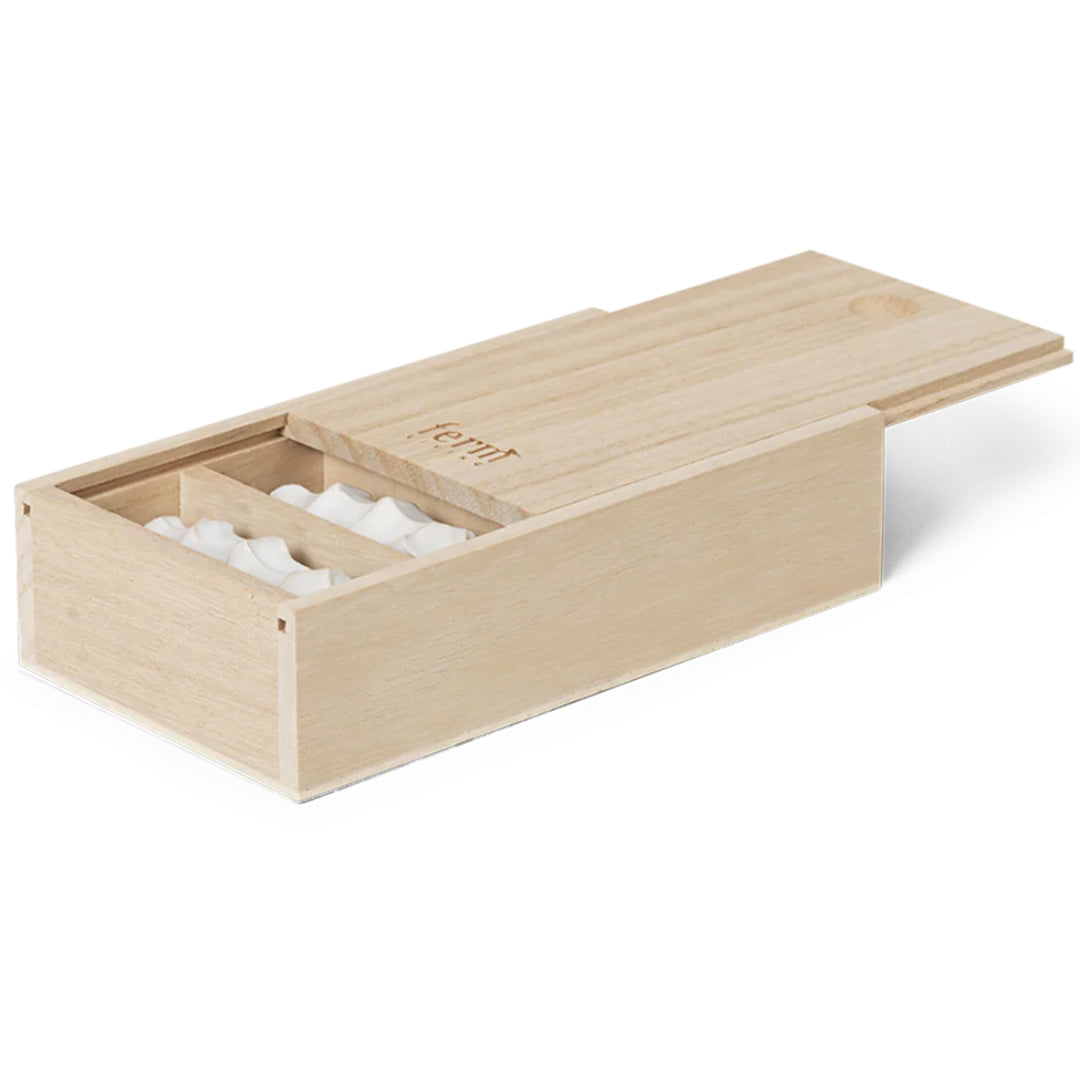 Enhance any dining experience with the Ferm Living Serre Cutlery Rests, crafted with care from clay that is hand pressed by skilled artisans. Each rest bears distinctive finger indentations reminiscent of its 'Serre' namesake, derived from the French word meaning 'to press'. The set includes four rests, each uniquely finished with a reactive glaze that highlights its artisanal quality. Packaged in a reusable wooden box featuring four compartments, it is perfect for both gifting and storing these elegant pieces between uses.