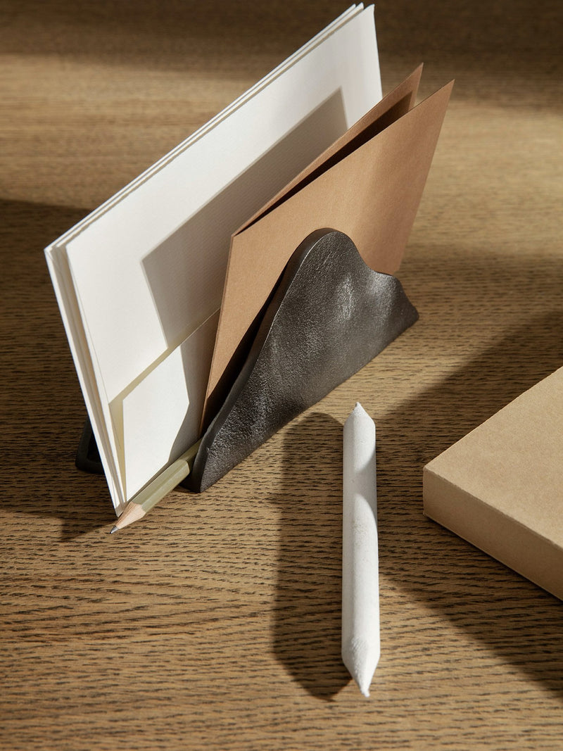 Made from recycled casted aluminum. This office or work desk accessory features a rough, matte and blackened finish that contrasts its fluid and organic silhouette.