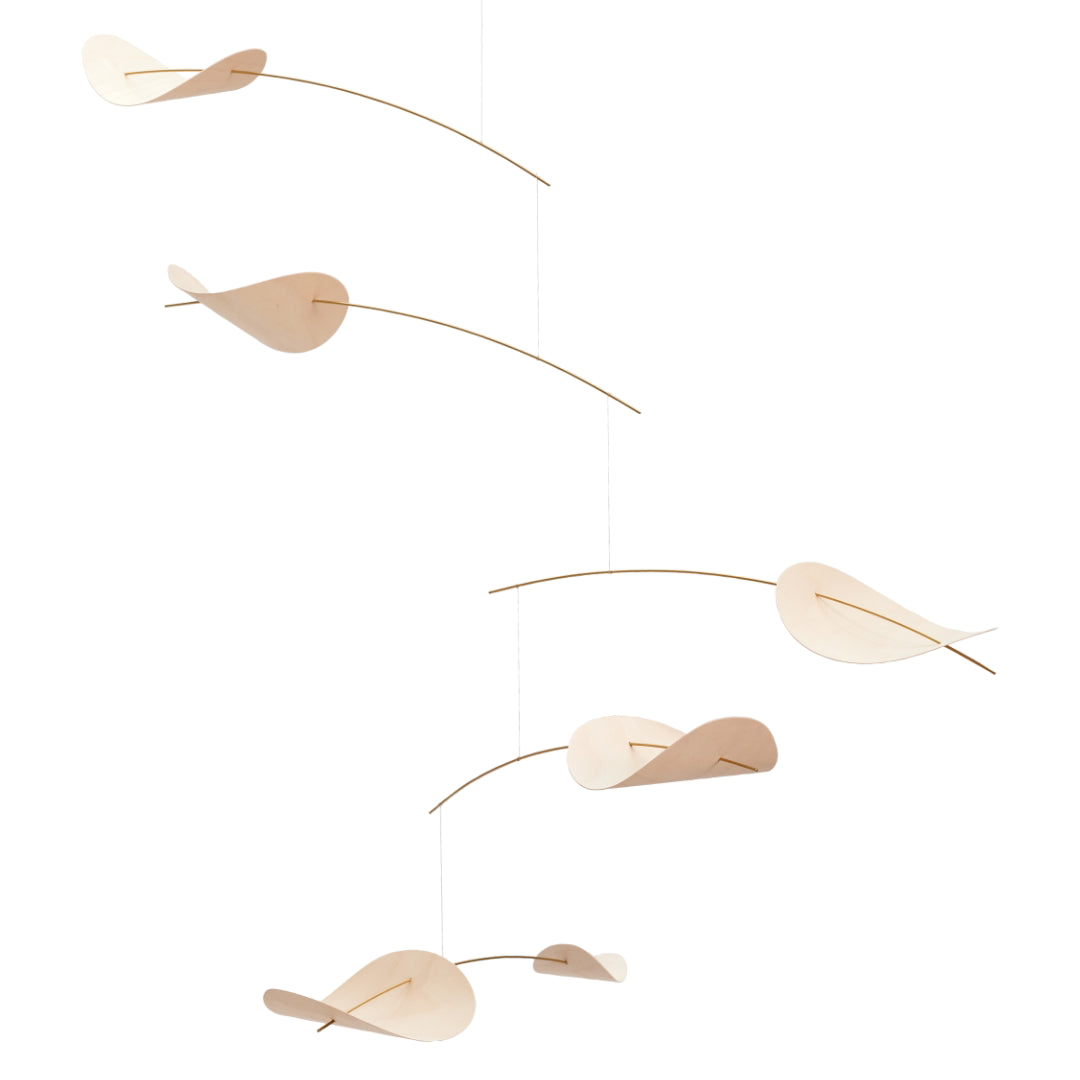 The Flensted Drifting Clouds Mobile is a gentle reminder of what it feels like to lie in a field of grass on a warm summer day, watching the clouds drift over the blue sky.