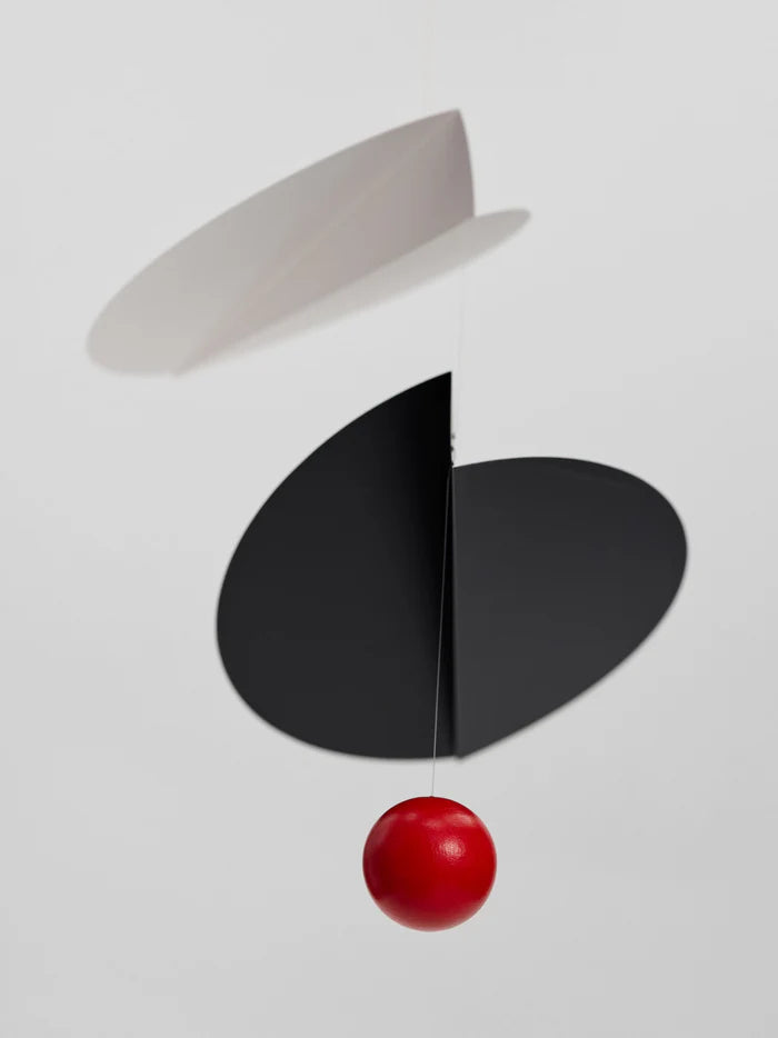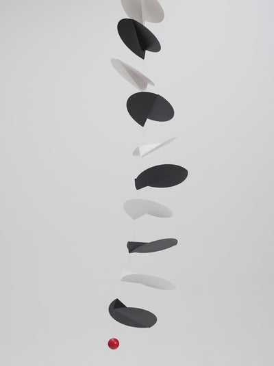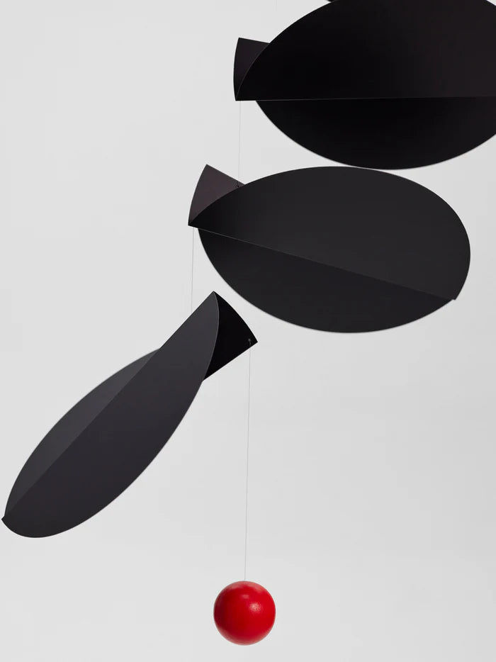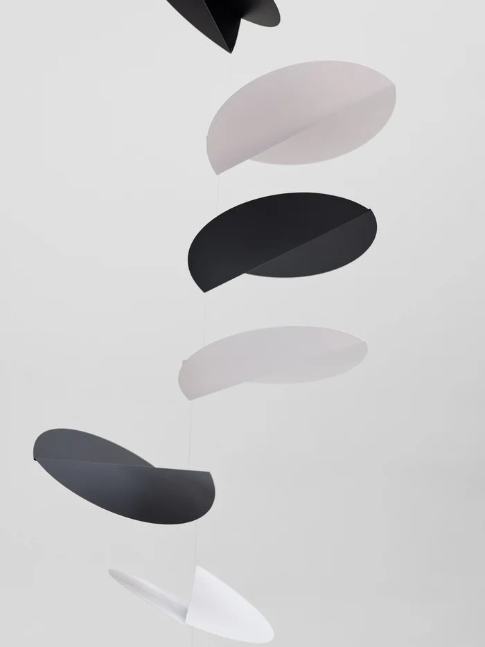 Designed by Ole Flensted in 2004, the Flensted Turning Leaves Mobile is perfect to hang in a corner. An ode to the turning leaves of autumn, arrange the elements along the wire in groups or evenly align the wire. Made by hand in Denmark with serigraphic foil and wood, it comes in black and red or white and black.