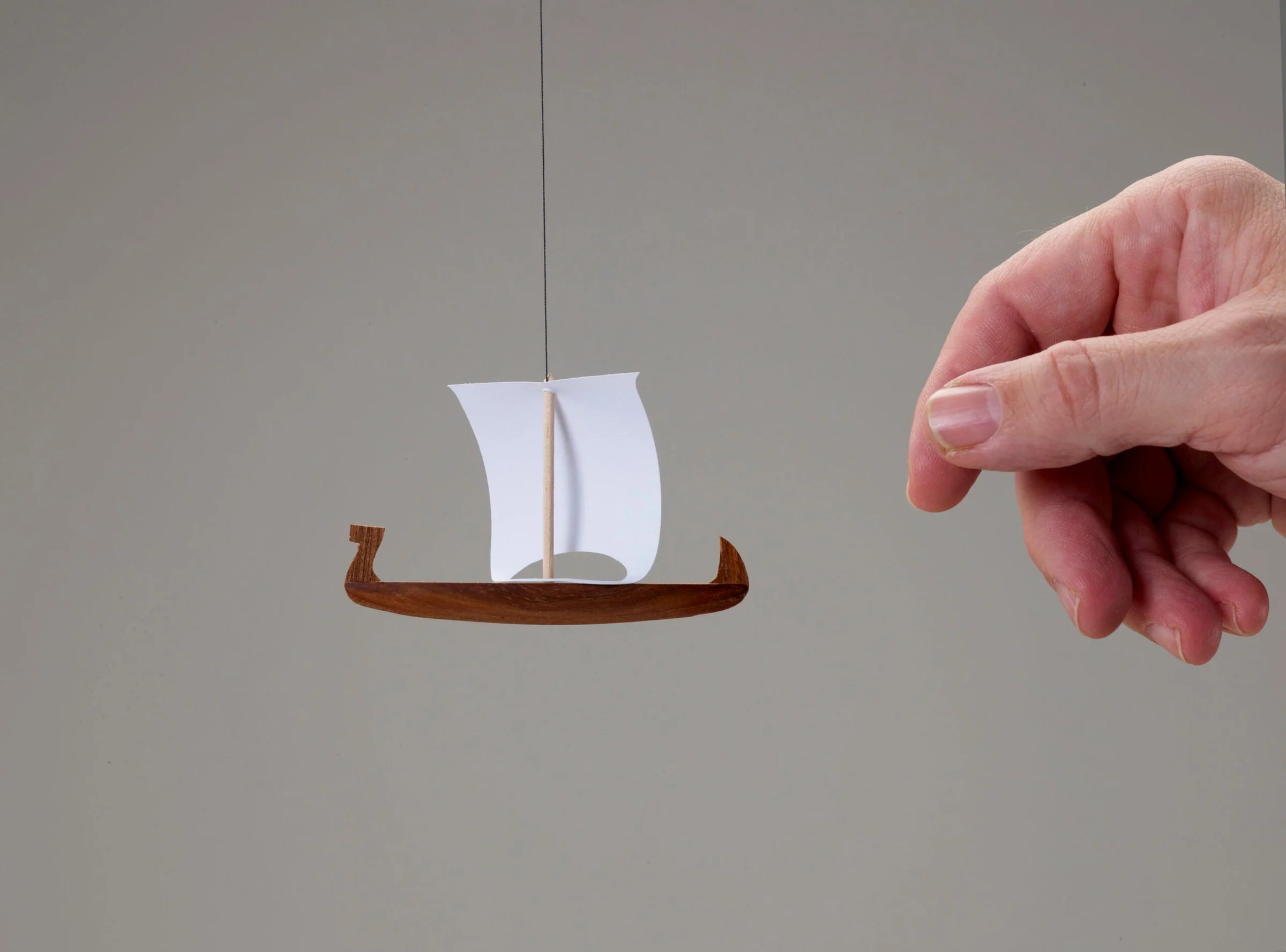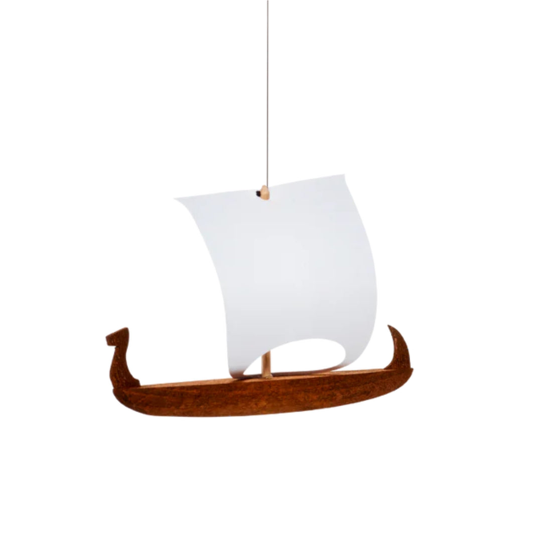 Viking 1 Mobile is a charming Danish design by Christian Flensted from 1960, featuring a finely crafted teak ship with a simple cardboard sail. Its timeless form makes it a playful yet elegant accent for any room—from living areas to kitchens and kids' spaces.