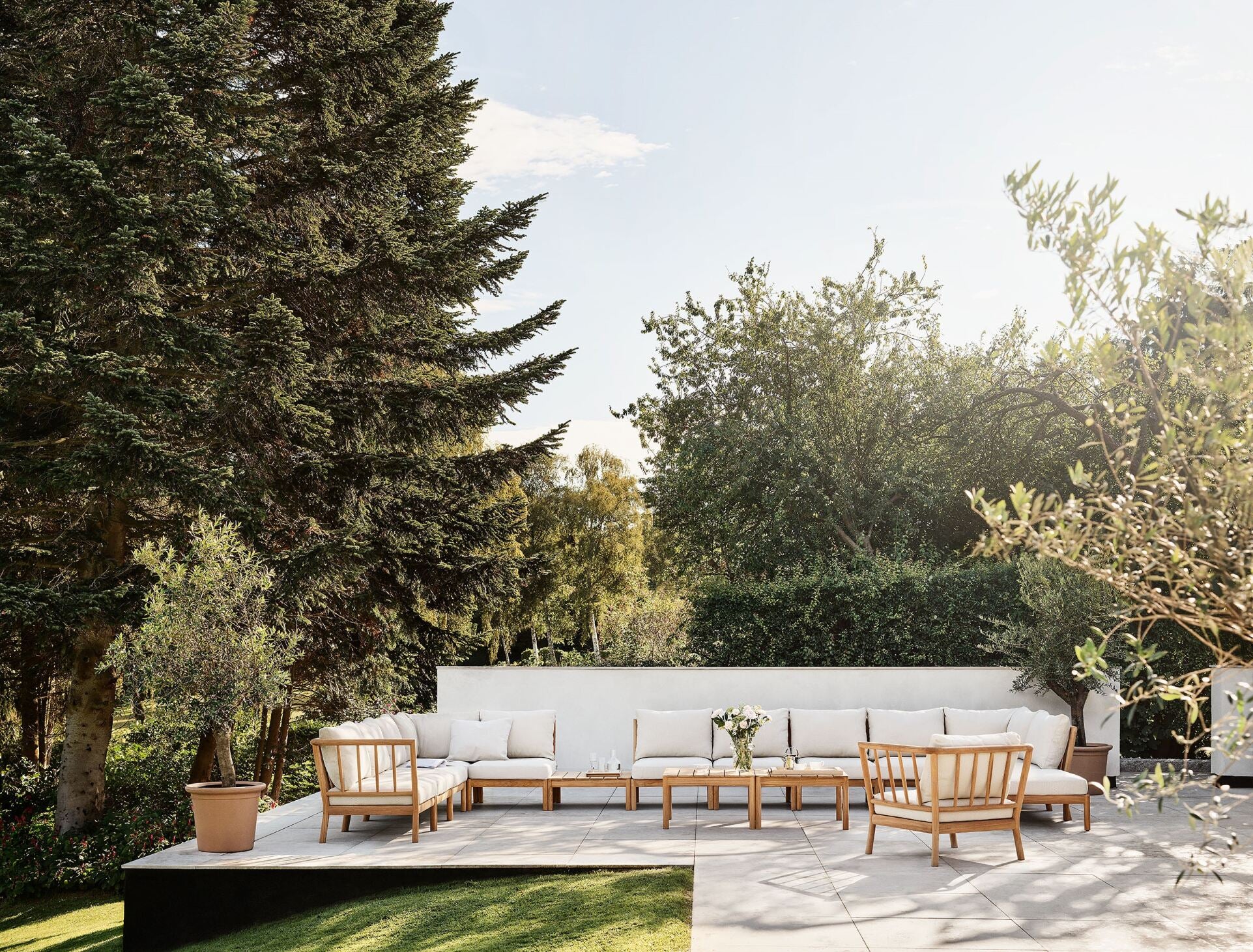 Material: Untreated FSC-certified teak wood │ Textiles are Oeko-Tex certified and are water and dirt-repellent and mildew resistant │ Cushions feature quick-dry outdoor foam filler, back pillows have fiber filling.