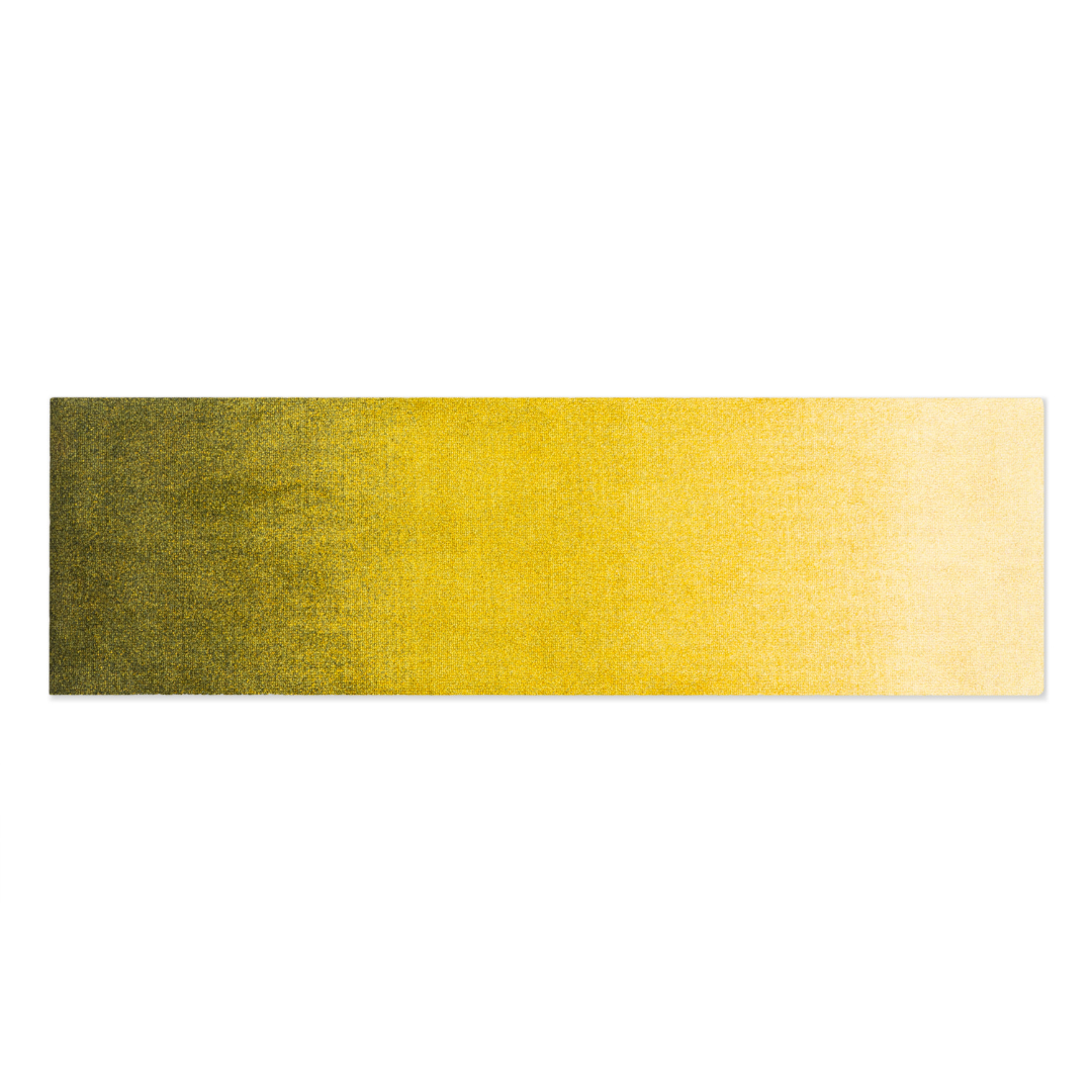 The Dis Floor Mat in Moss takes its colors from the stillness of a sun-kissed forest floor, with deep green hues that fade through tones of gold to a pale yellow.
