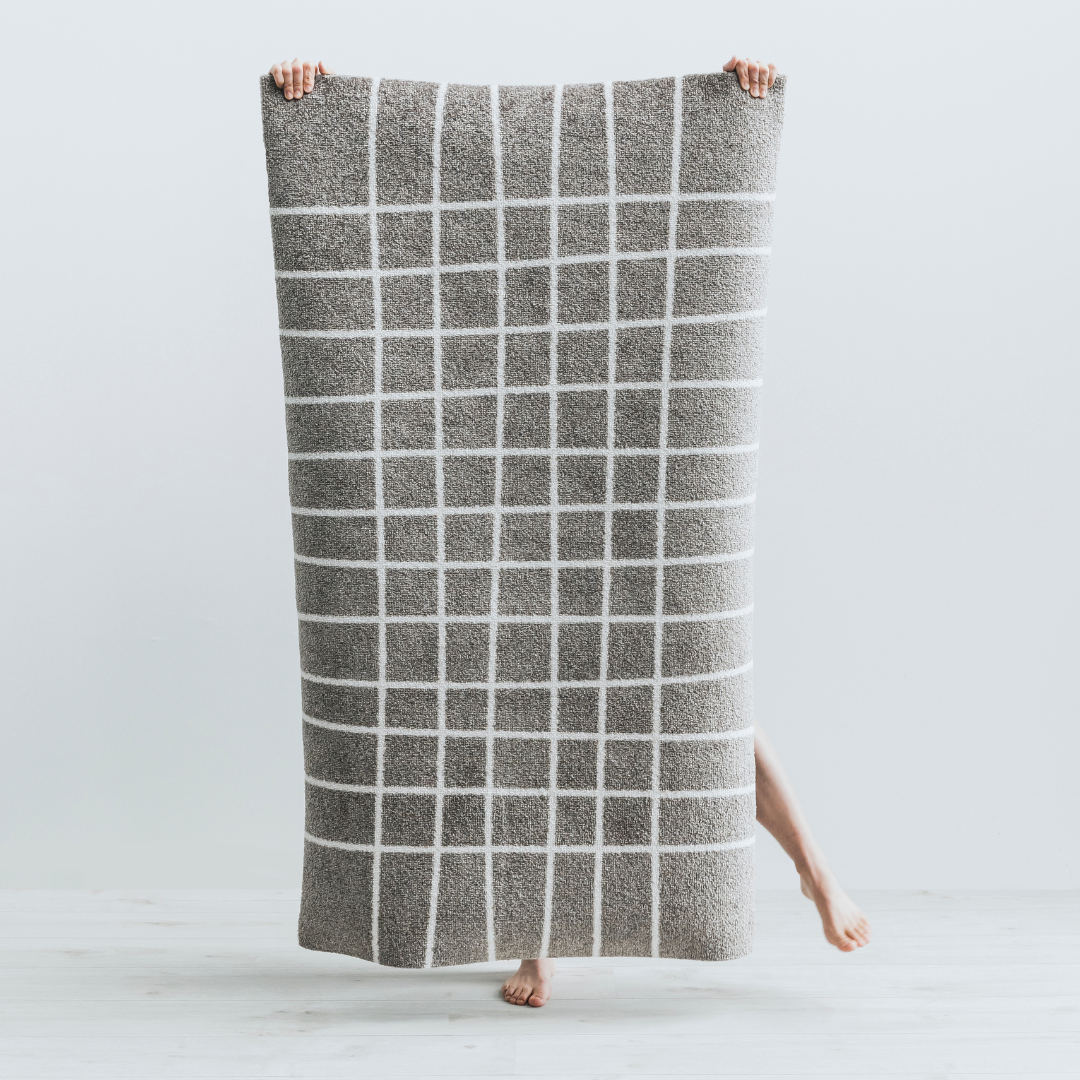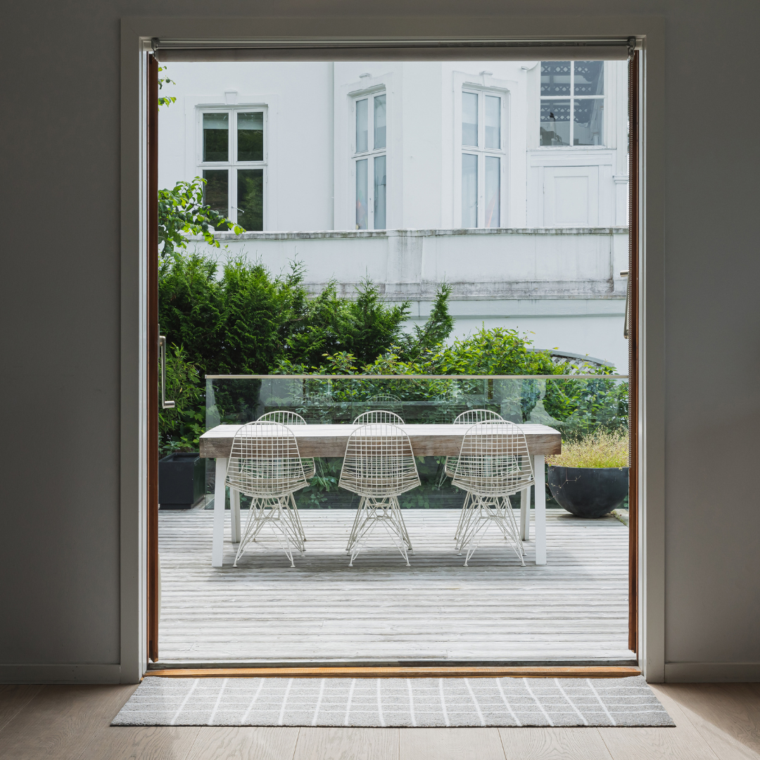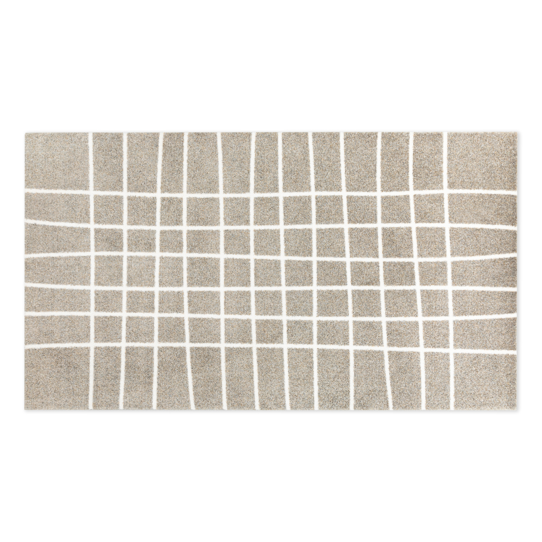 The Hand Floor Mat in Travertine features meticulously hand-drawn lines that soften the rigid, rectangular grid. The mat is named after a limestone, reflected by the grey background with details in white. It's a delicate and beautiful addition to any interior desiged by Kristine Five Melvær.