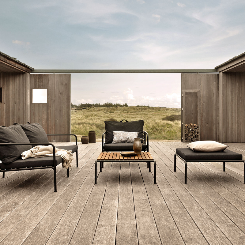 The AVON Outdoor Table is part of the AVON collection, designed with a focus on creating a lounge collection with a very light appearance and a low sleek profile while maintaining a high level of comfort. The low lines of the frame ensure that the design always appears stylish, with and without cushions - in warmer months and colder months. The handle of the cushions is a statement while also making them easy to grab and store if needed. The cushions are made in Sunbrella Heritage fabric which contains 50% recycled acrylic. Colorful fiber ends from the process of recycling may appear in the weave to create a unique and natural look.
