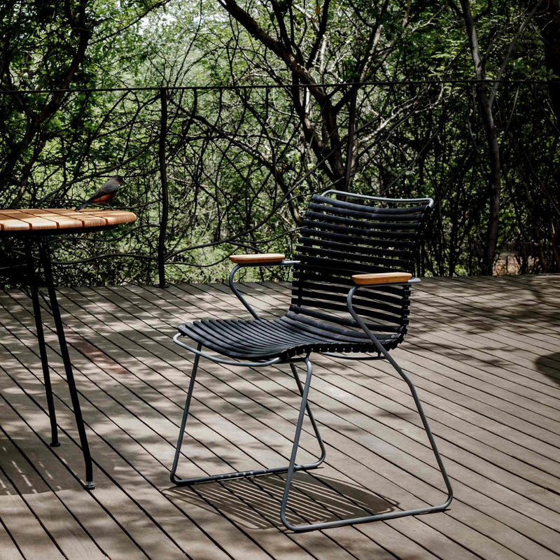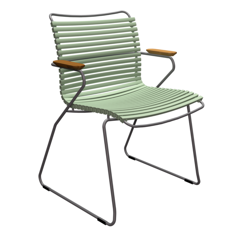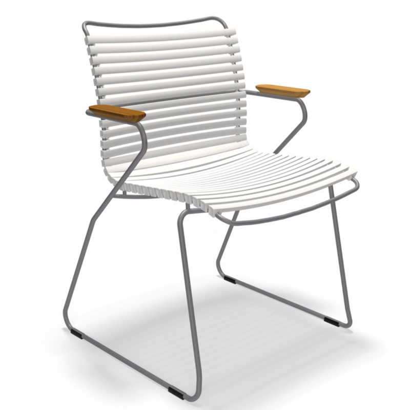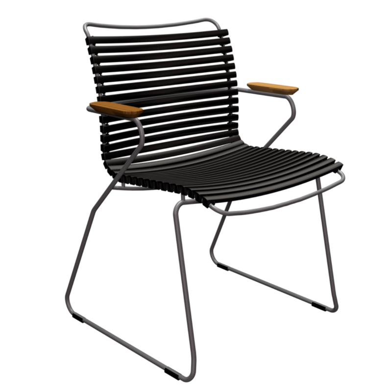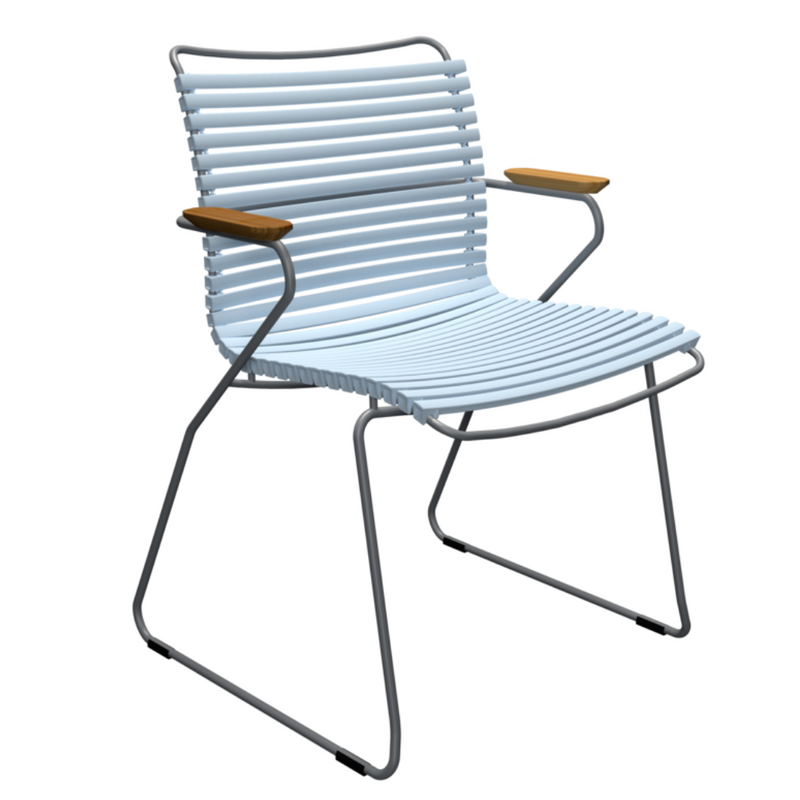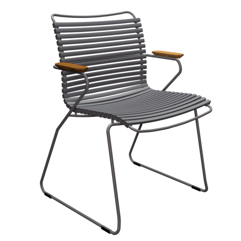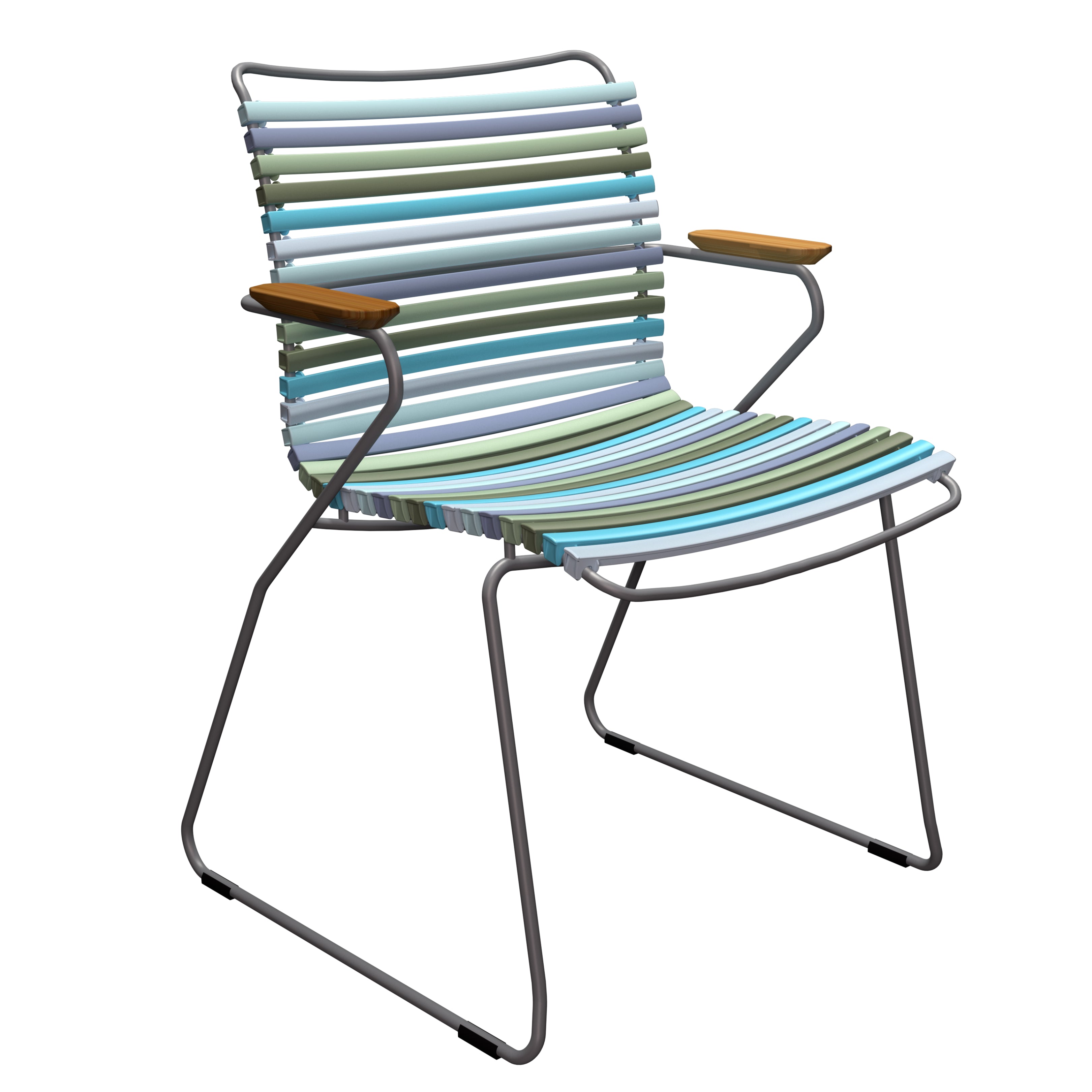 The CLICK Outdoor Dining Chair is a simple, honest, and ergonomically well-thought-out design. The plastic lamellas that make up the seat are composed of exactly the right strength and resilience to provide excellent cushion-free comfort. The lamellas can be CLICKed on and off - which makes it possible to modify the look of the chair simply by changing - or mixing the different lamella colors. The stackable CLICK Dining Chair comes in 11 colors and is also available without an armrest.