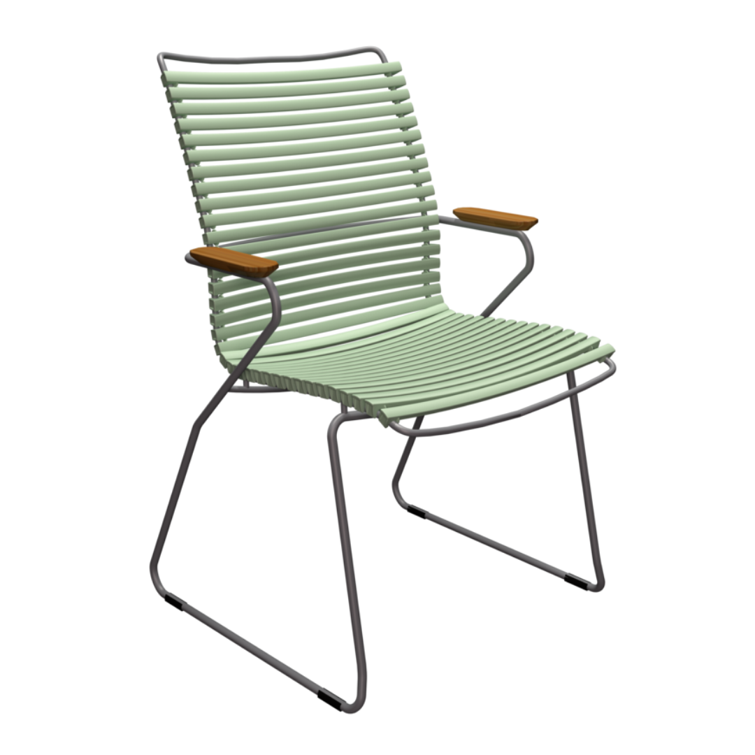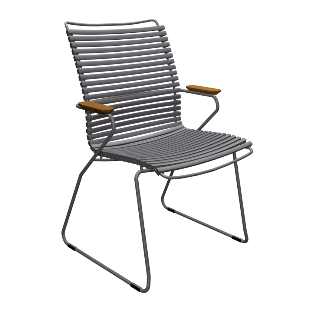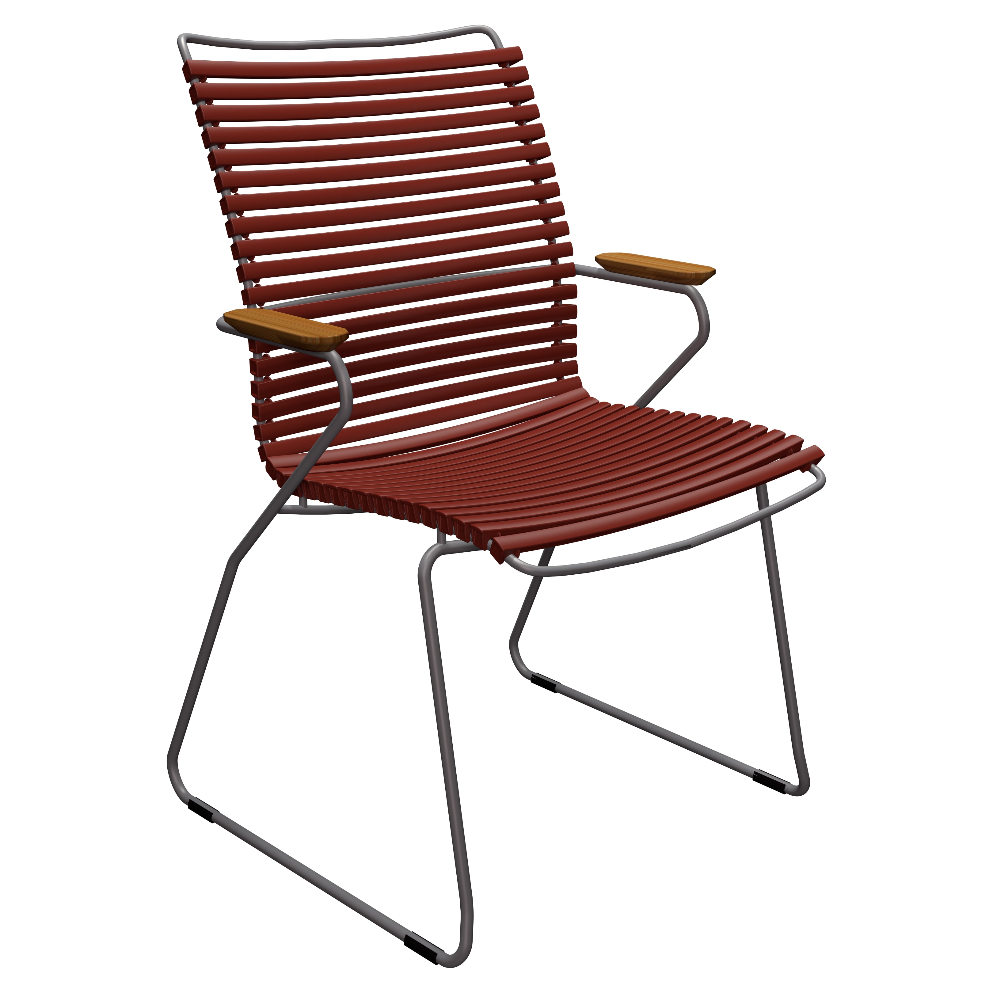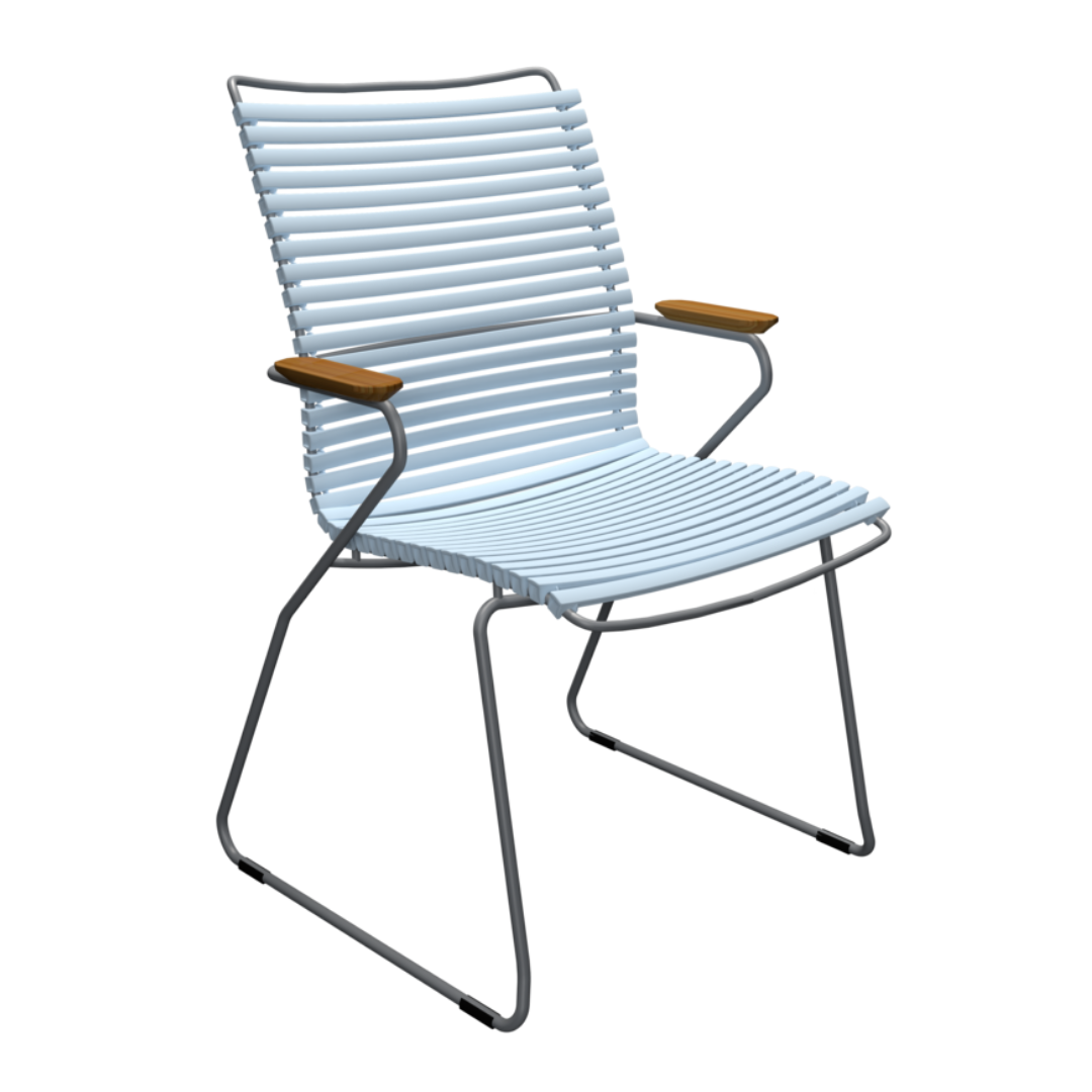 The CLICK Outdoor Dining Chair - Tall Back is a simple, honest, and ergonomically well-thought-out design. The plastic lamellas that make up the seat are composed of exactly the right strength and resilience to provide excellent cushion-free comfort. The lamellas can be CLICKed on and off - which makes it possible to modify the look of the chair simply by changing - or mixing the different lamella colors. The stackable CLICK Dining Chair - Tall Back comes in 11 colors.