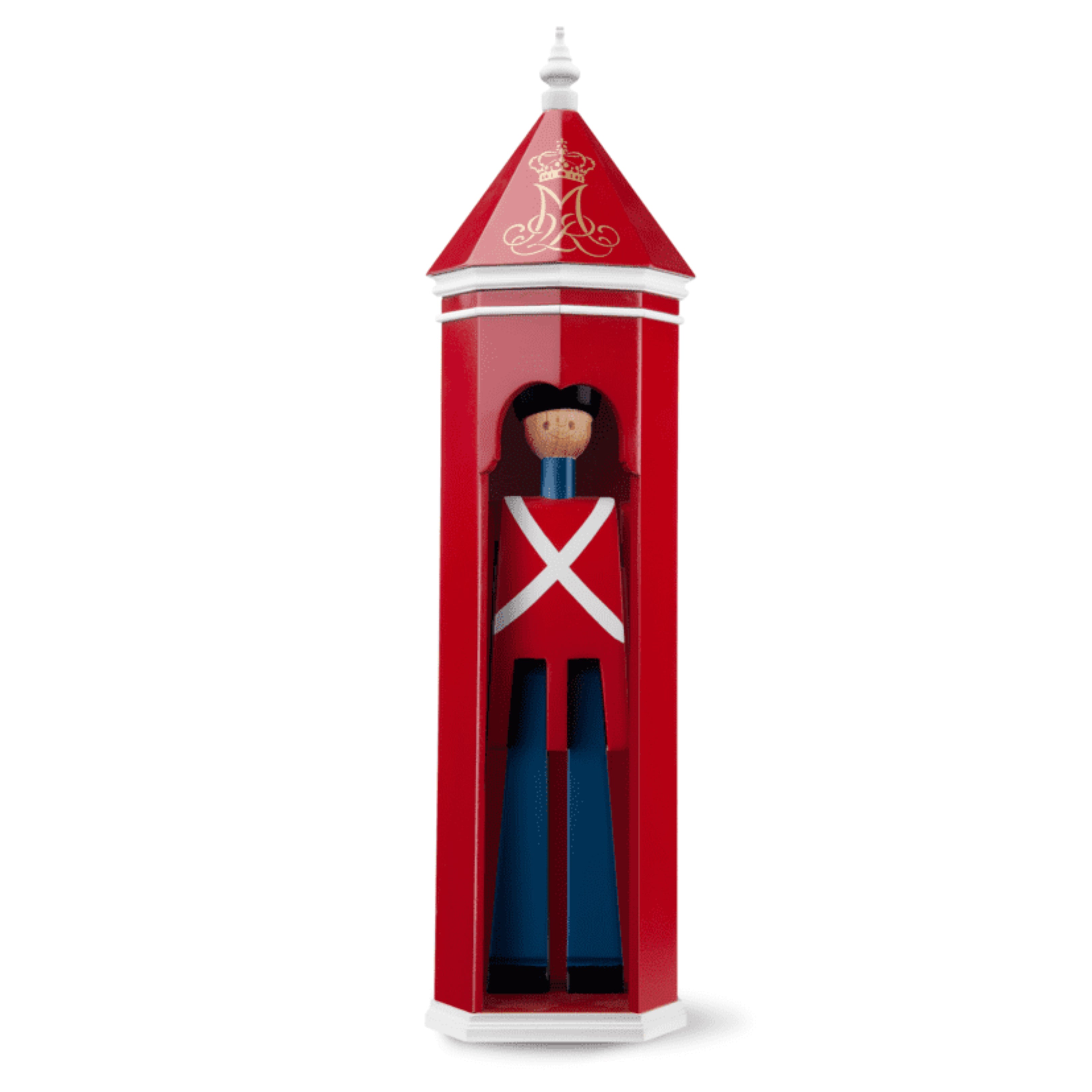 Introducing an exceptional wooden sentry box crafted for Kay Bojesen’s exquisite Royal Guardsmen Collection. Standing at 14.2 inches, this box is a refined miniature version inspired by the original Danish military sentry boxes. Since 1658, the Royal Danish Life Guards have been the stewards of Denmark's palaces and castles. In 1942, Kay Bojesen created his iconic Royal Guardsmen, and now you can offer them a dignified refuge in this elegantly designed sentry box, adorned in classic red and white and featuring the Royal Monogram in gold.